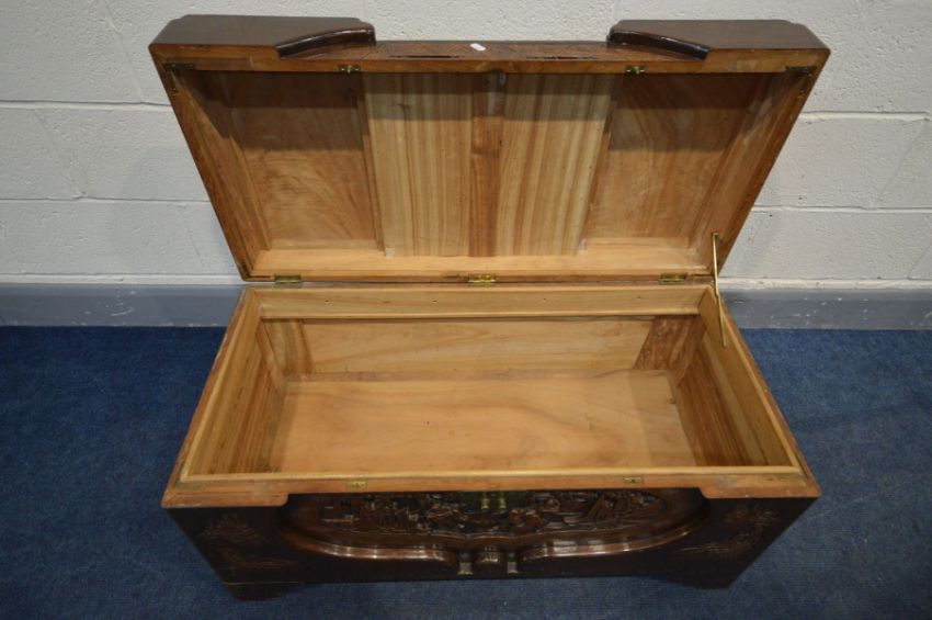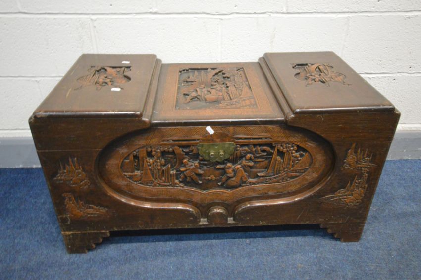AN ORIENTAL HARDWOOD CAMPHORWOOD CHEST, surrounded with carved scenes throughout, on stepped feet, width 94 x depth 46cm x height 50cm (no internal tray and loose lock)