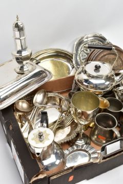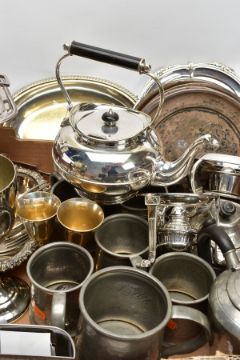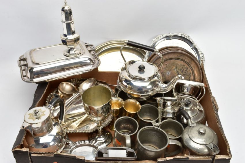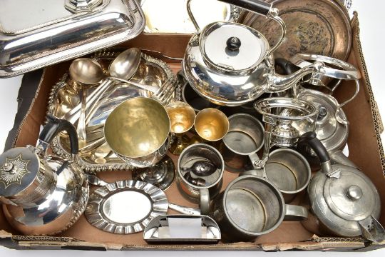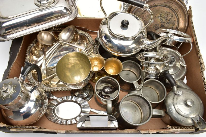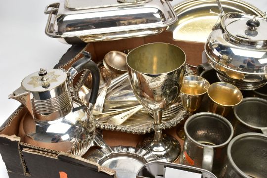 A BOX OF MAINLY SILVER PLATED WARE, to include an entrée dish, a goblet, two plate stands and warmers, two teapots, together with a pewter tankard, six small pewter tankards, a pewter teapot and coffee pot etc