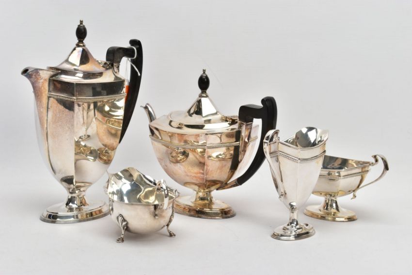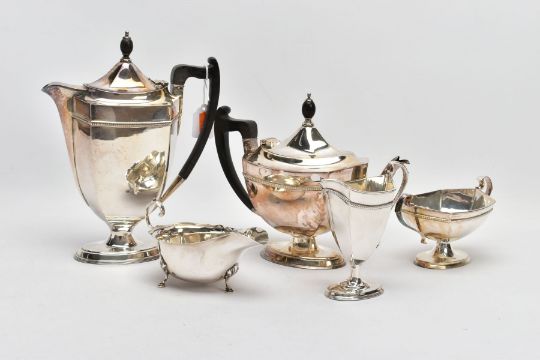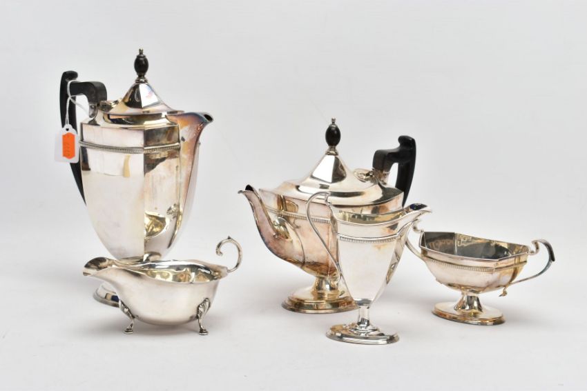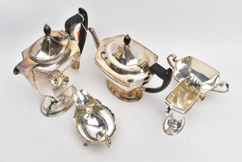 A FOUR PIECE MAPPIN & WEBB SILVER PLATED TEA SERVICE AND A SILVER SAUCE BOAT, the tea service comprising a tea and coffee pot, helmet cream jug and sugar bowl, all of hexagonal form with ebonised wood handles, stamped Mappin & Webb Prince's plate Triple Deposit, together with an early 20th century silver sauce boat, hallmark Adie Brothers Ltd, Birmingham 1914, approximate gross weight of sauce boat 94.5 grams