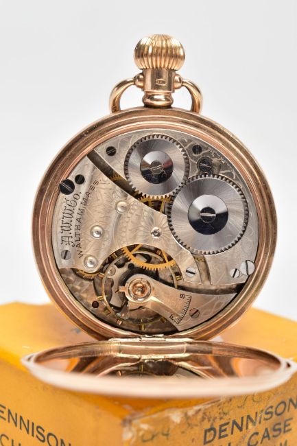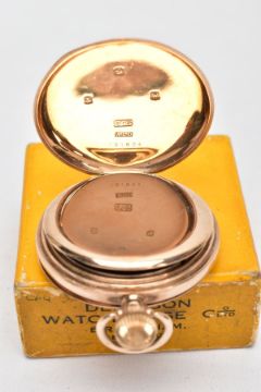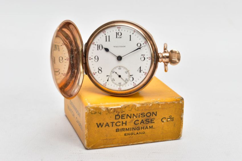 A 1920'S 9CT GOLD FULL HUNTER WALTHAM POCKET WATCH, the white face with black Arabic numerals and outer red numbers 5 to 60, a subsidiary seconds dial, movement signed A.W.W.Co. Waltham Mass, dust cover, case back and bow with 9ct hallmark for Birmingham 1912, diameter 48mm, approximate gross weight 94.9 grams, with maker's box (Condition report: overall good condition with light surface scratches to gold, enamel dial in good condition, watch currently working, please note time keeping is untested so is not guaranteed)