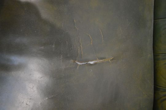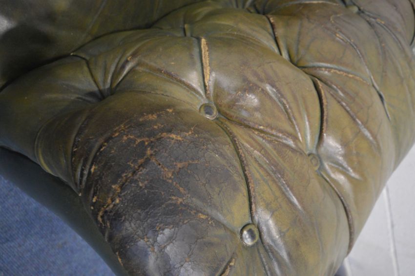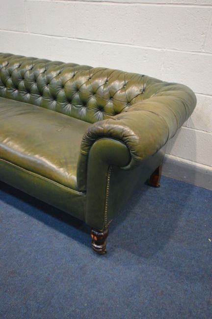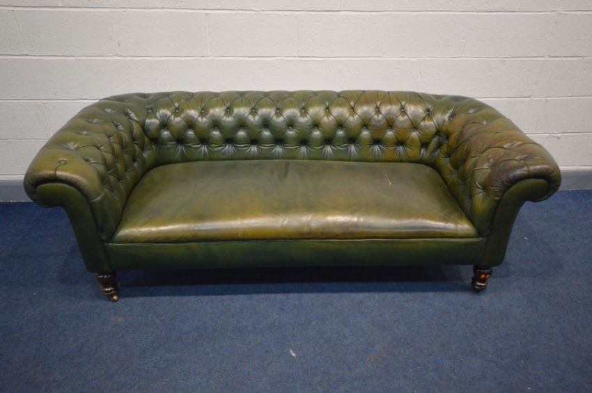 A VICTORIAN GREEN LEATHER CHESTERFIELD SEETEE, sprung seated on mahogany turned legs (condition - split to seat, worn leather to left armrest)