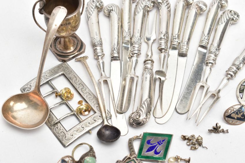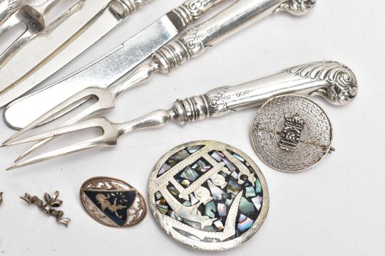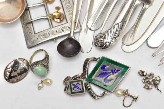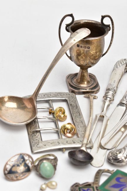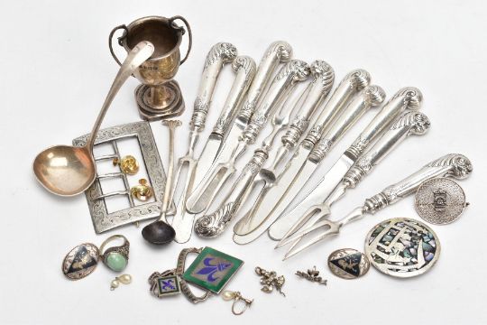 A SELECTION OF MAINLY SILVER AND WHITE METAL ITEMS, to include a pair of interlocking design earrings, stamped 9ct, approximate gross weight 3 grams, together with five matching silver handled butter knives, six silver handled matching Mappin & Webb fruit forks, approximate total gross weight of knives and forks 293.9 grams, 9.4 ozt, a Mappin & Webb silver sauce ladle, a miniature silver trophy, a pair of Siam earrings, a Mexican inlaid Alpaca brooch etc., most with hallmarks or marks to indicate silver, approximate total gross weight of remaining items 195.4 grams, 6.2 ozt