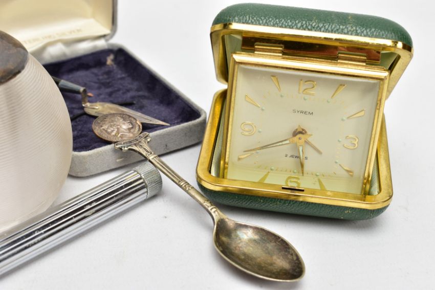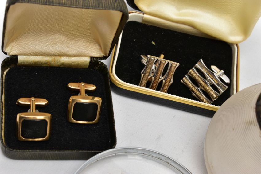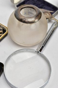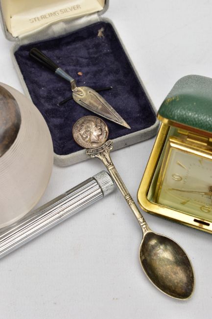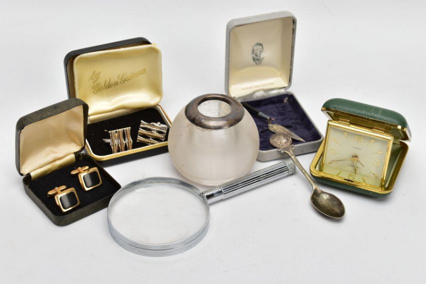 A BOX OF MISCELLANEOUS ITEMS, to include a trowel shaped sliver bookmark, a spherical glass candlestick holder with silver collar, both with silver hallmarks, a travel clock, two pairs of cufflinks, a commemorative teaspoon and a magnifying glass