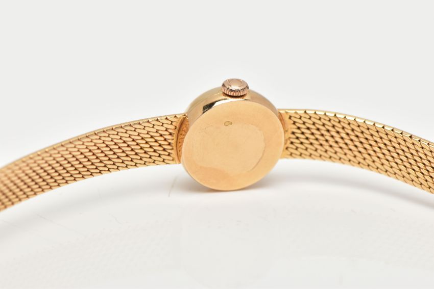 A MID TWENTEITH CENTURY OMEGA LADIES GOLD WRISTWATCH, a small round case measuring 15.4mm in diameter, silver dial signed Omega, baton hour makers, mechanical hand wound movement, fitted to an integral graduated mesh flat link bracelet, measuring 193.0mm in length to a fold over clasp, stamped '750', approximate gross weight 24.58 grams (condition report: overall condition very good, minimal surface scratches to the case and bracelet, watch running however, timekeeping untested)