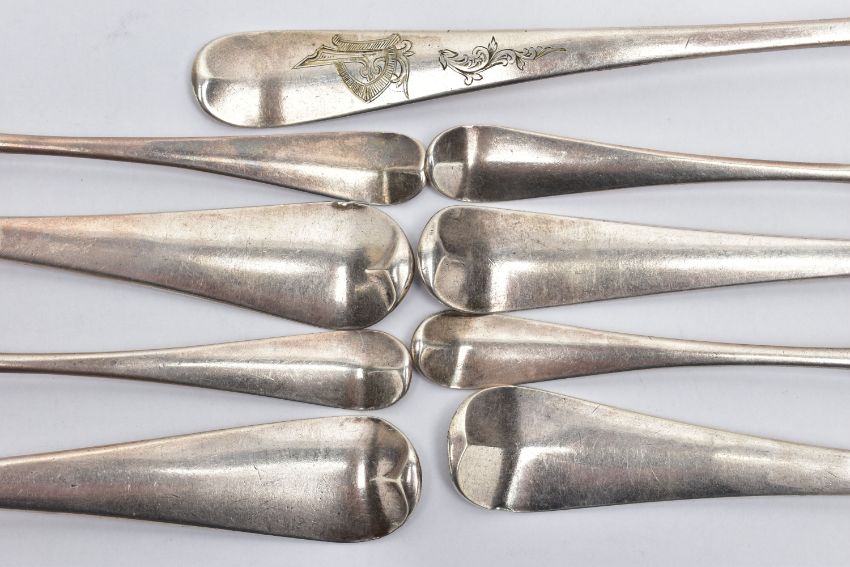 FIVE 18TH CENTURY HANOVARIAN PATTERN TABLESPOONS AND A SET OF FOUR PICTURE BACK TEASPOONS, the teaspoons engraved with initials EC to the back of the handles, the back of the bowls decorated with a bird and chicks design, makers mark TE over GS, probably Thomas Evans & George Smith III, the tablespoons comprising a pair with double drop, engraved M*B to the handles, maker's mark RP, probably Robert Perth, London 1754 a pair with shell backs, engraved to the handles EM, one with later engraved monogram and scrolls to the front, maker Thomas Northcote, London 1776 and another double drop, engraved EM to handle, maker Ebeneezer Coker, London 1745, gross weight 9.88ozt, 307.3 grams (9) (Condition report: the picture backs are fairly worn, the Thomas Northcote spoon with the later engraving has a worn bowl, otherwise in reasonable condition, some marks partially rubbed or indistinct)