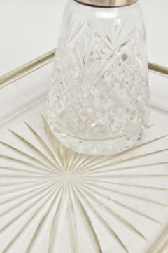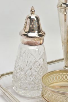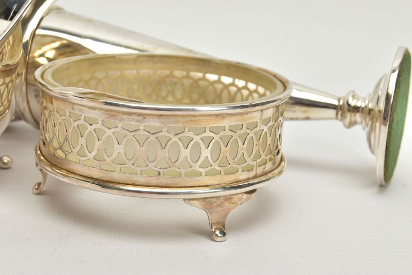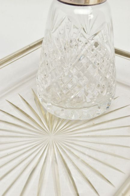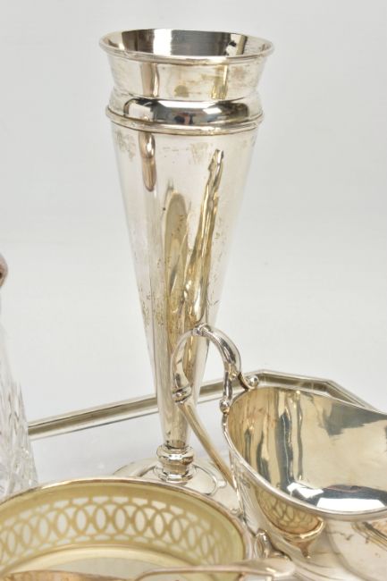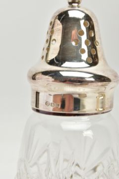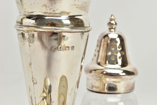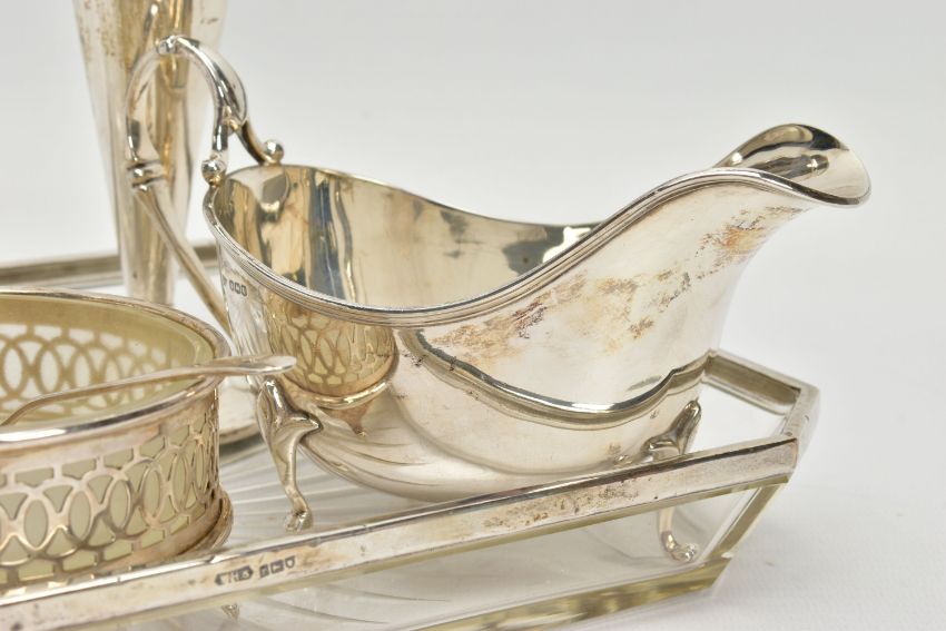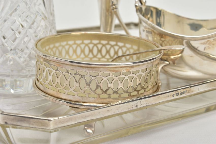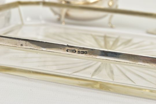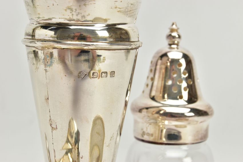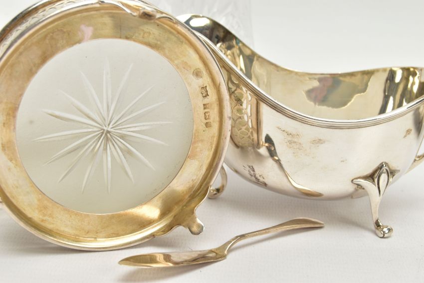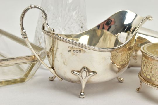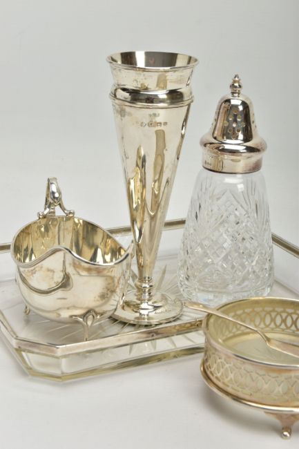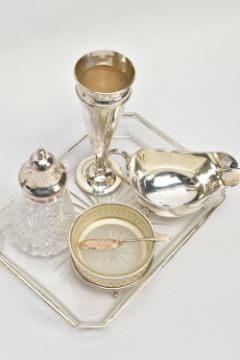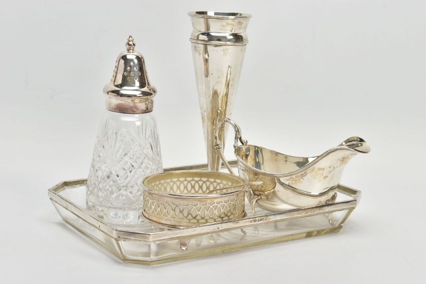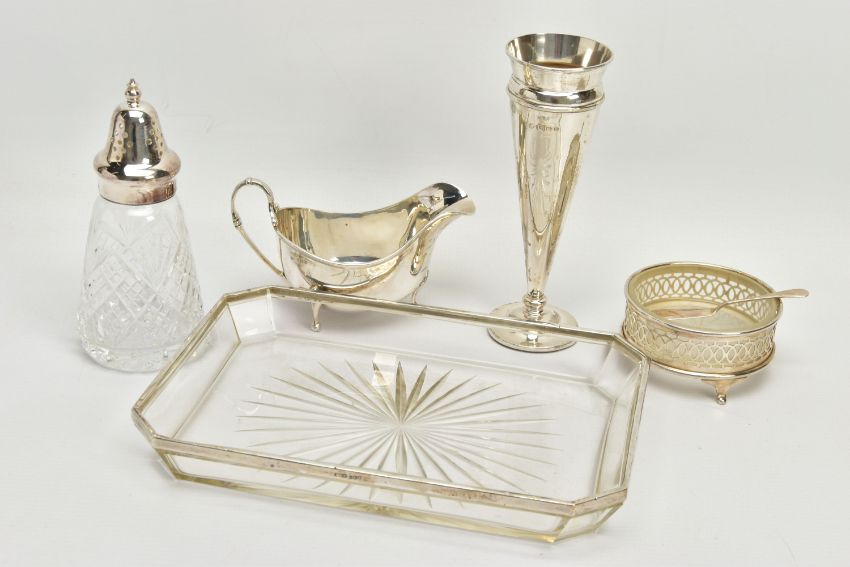 A PARCEL OF SILVER AND SILVER MOUNTED ITEMS, comprising a George V sauce boat, on three cabriole legs, makers Walker & Hall, Sheffield 1928, an Edwardian conical posy vase with stepped circular loaded foot, maker's mark rubbed, Birmingham 1906, height 18cm, a Royal Brierley Crystal sugar sifter with silver pull off cover and collar mount, maker Francis Howard Ltd, Sheffield 1994, an Elizabeth II butter dish and knife, the frosted glass dish in a pierced frame with three cabriole legs, makers Mappin & Webb, Birmingham 1984/85 and a shaped rectangular glass dressing table tray with silver rim, star cut base, maker William Henry Sparrow, London 1912, width 25cm, gross weight of weighable silver 7.54ozt , 235 grams (6) (Condition report: posy vase has a few dints, frosted glass butter dish has a small rim chip, rim on tray is loose in a few places, otherwise in generally good condition with slight rubbing to hallmarks)
