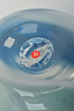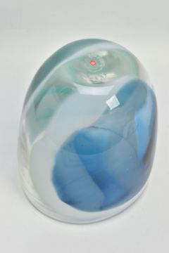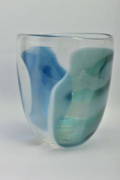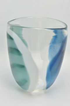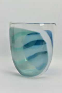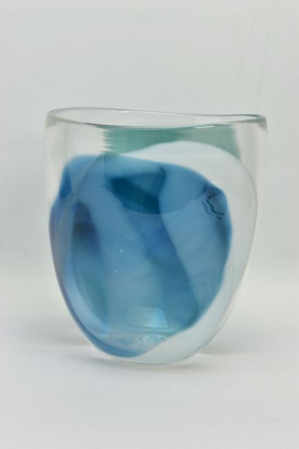 ANNETTE MEECH (CONTEMPORARY) A LARGE STUDIO GLASS VASE, of compressed form with blue, green and white decoration, approximate height 24cm, unsigned but acquired directly from the artist by the vendor in 1988 (Condition report: no obvious damage)