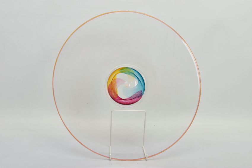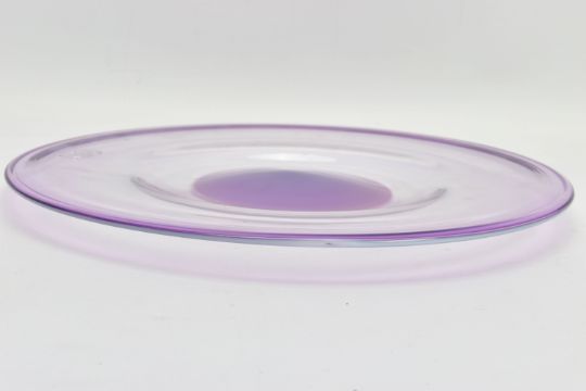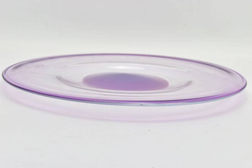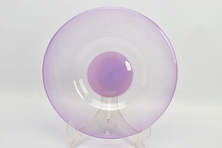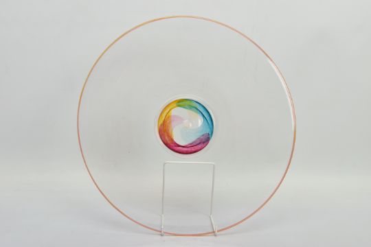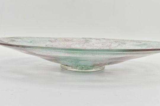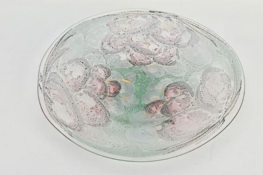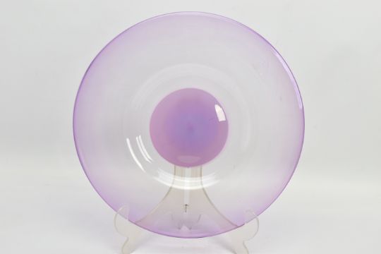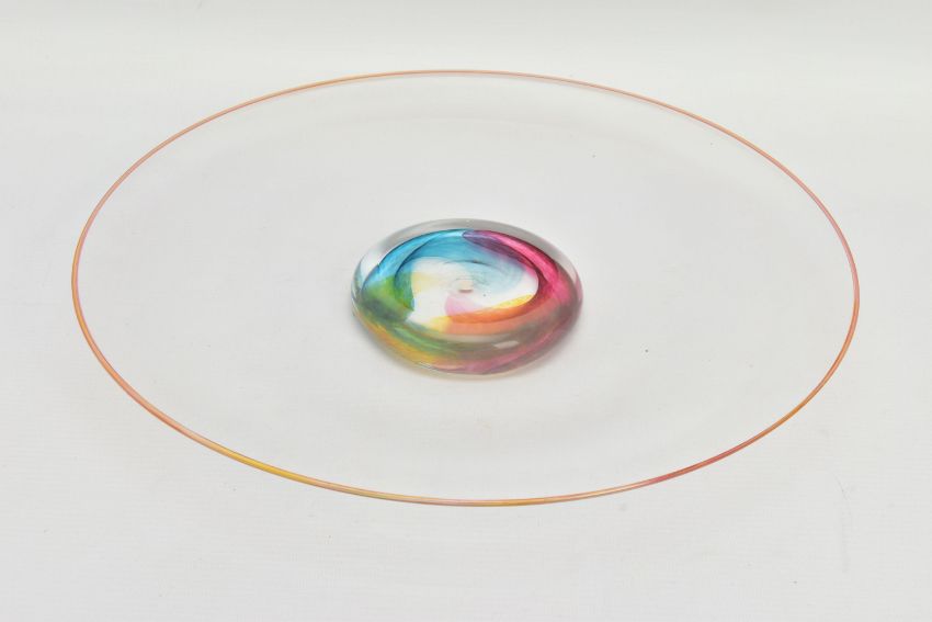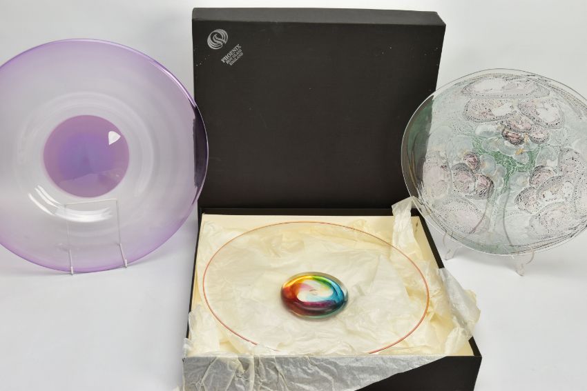 THREE PIECES OF LATE 20TH CENTURY BRITISH STUDIO GLASS, comprising a boxed Phoenix Hot Glass shallow dish raised on a multicoloured foot, unsigned, approximate diameter 37cm, Barry Cullen charger with a purple centre, signed and dated '83, approximate diameter 39cm and a Sally Jean Penn Smith shallow footed dish 'Fruits of the vine', signed, titled and dated 1998, approximate diameter 35cm (3) (Condition report: Cullen charger heavily scratched to the base, no other obvious damage noted)