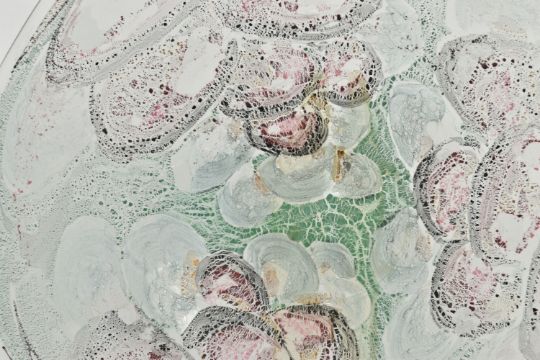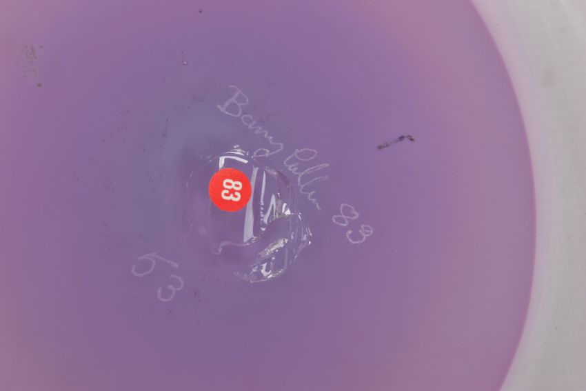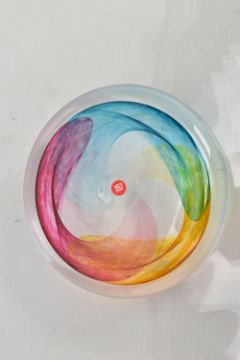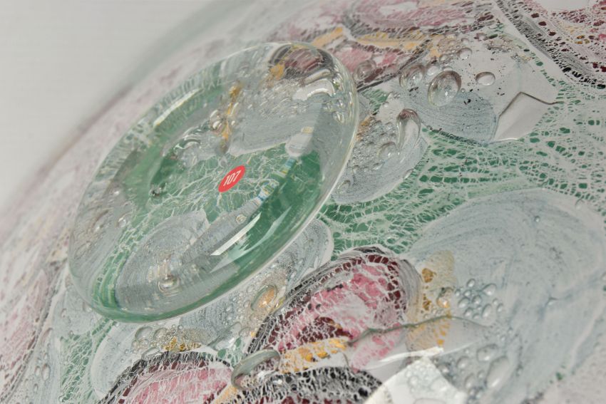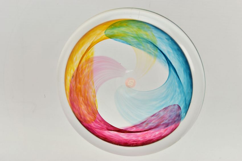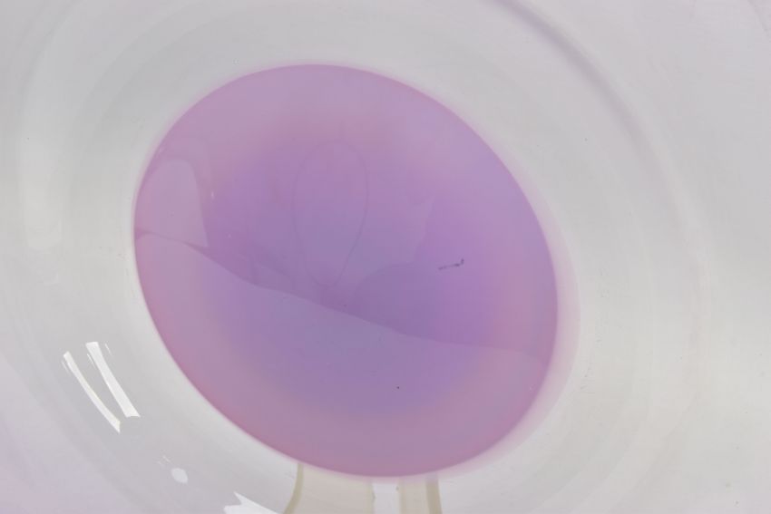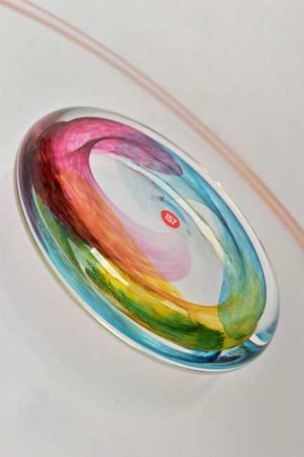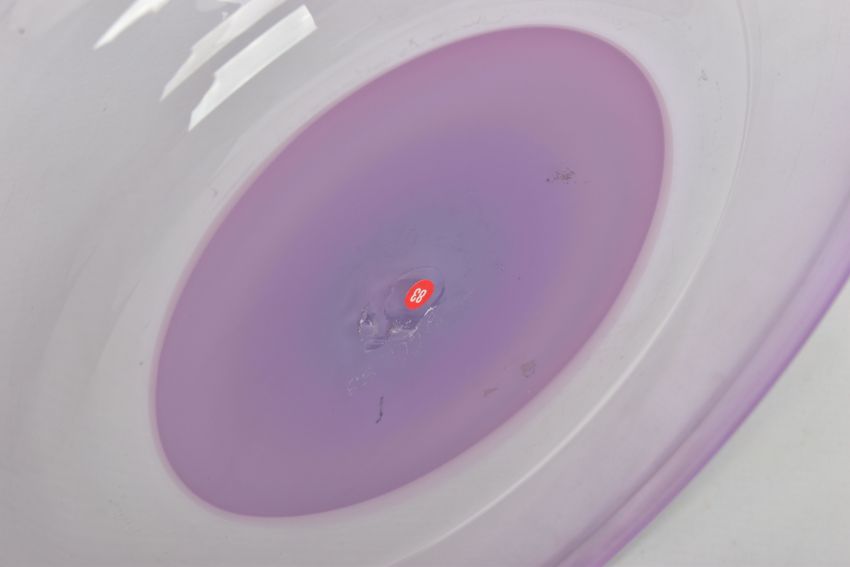 THREE PIECES OF LATE 20TH CENTURY BRITISH STUDIO GLASS, comprising a boxed Phoenix Hot Glass shallow dish raised on a multicoloured foot, unsigned, approximate diameter 37cm, Barry Cullen charger with a purple centre, signed and dated '83, approximate diameter 39cm and a Sally Jean Penn Smith shallow footed dish 'Fruits of the vine', signed, titled and dated 1998, approximate diameter 35cm (3) (Condition report: Cullen charger heavily scratched to the base, no other obvious damage noted)