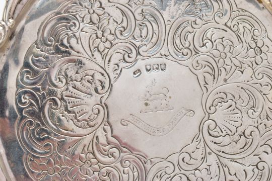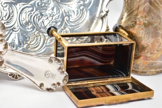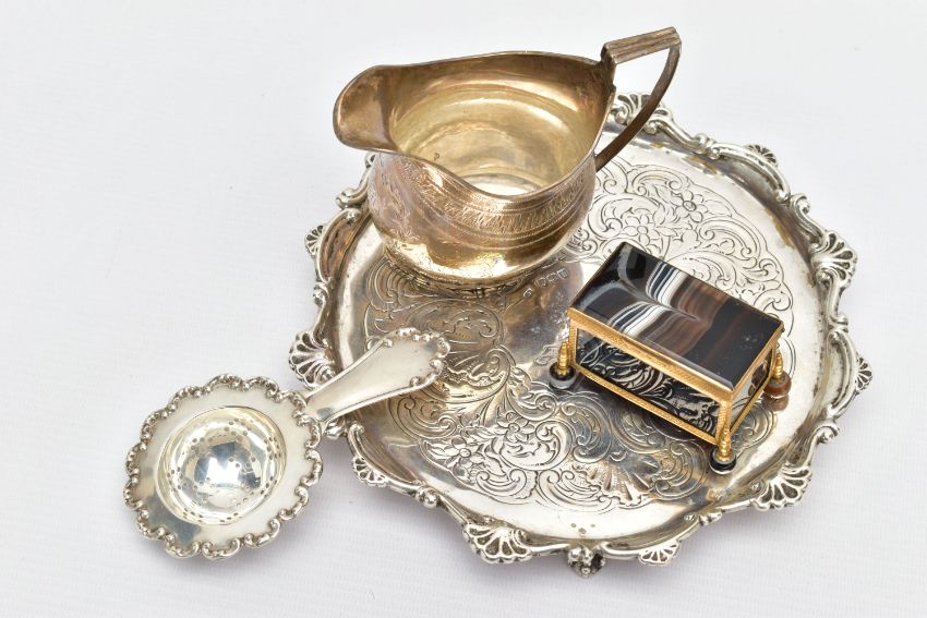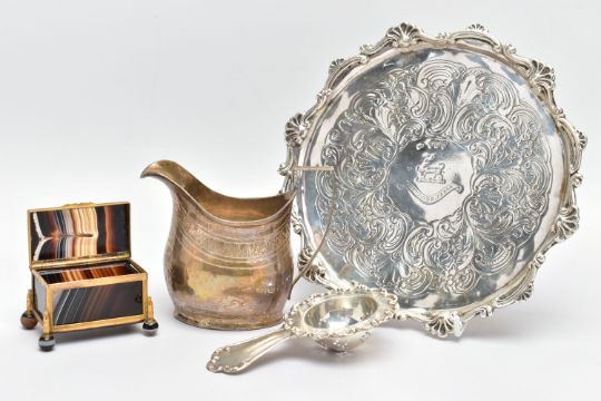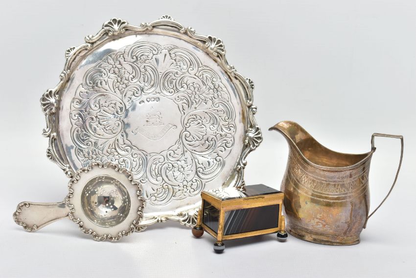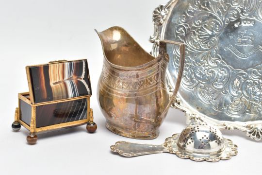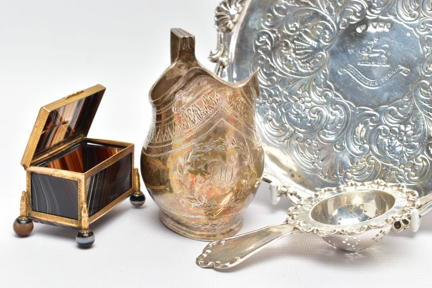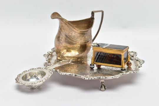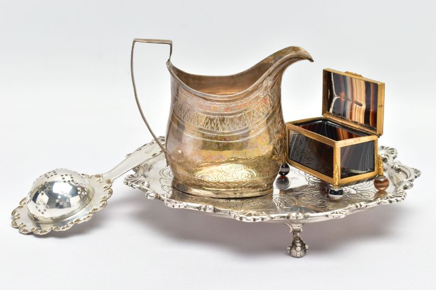 A GEORGE III SILVER CREAM JUG AND A VICTORIAN WAITER, a baluster form creamer jug detailed with a bright cut pattern and foliage wreath, engraved monogram, hallmarked 'Samuel & Edward Davenport' London 1802, a floral waiter tray raised on three talons feet, hallmarked 'AF' London 1892, approximate gross weight 14.75ozt, 458.8 grams, together with a white metal tea strainer, stamped sterling 0.925, approximate gross weight 1.03ozt, 31.9 grams, a banded agate trinket box (4) (Condition report: general moderate wear, solder marks on the jug, wearing to engraving of waiter, would benefit from a gentle clean and polish)