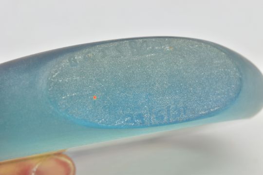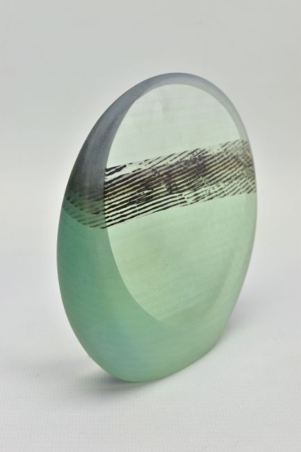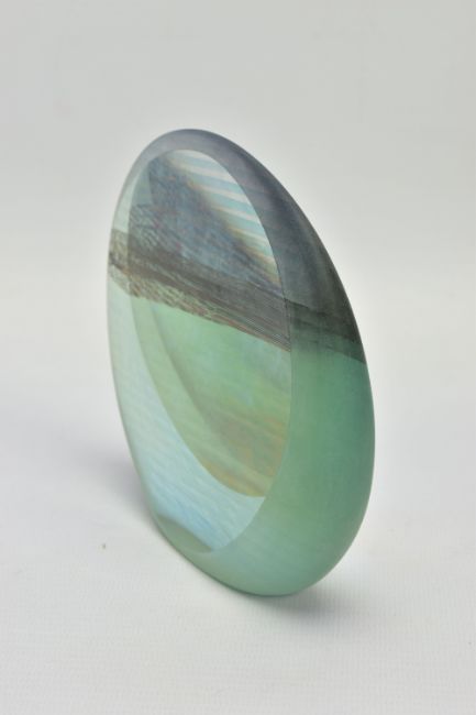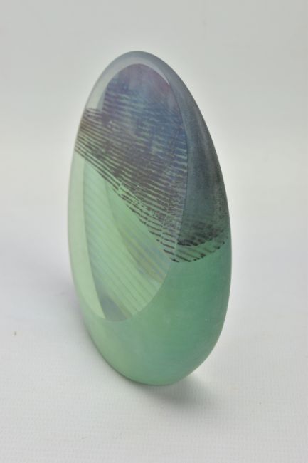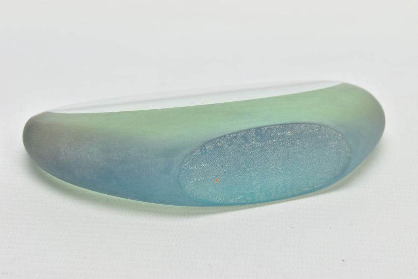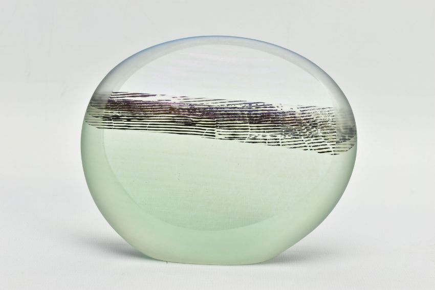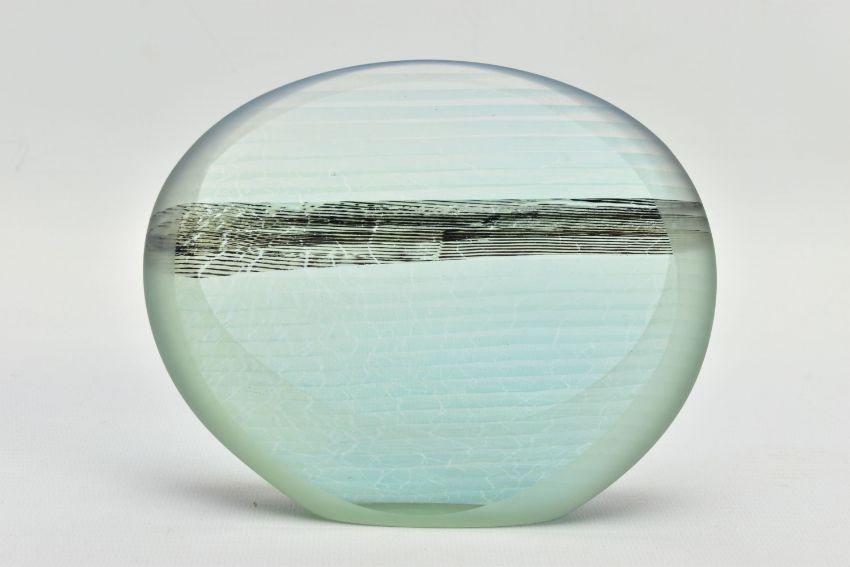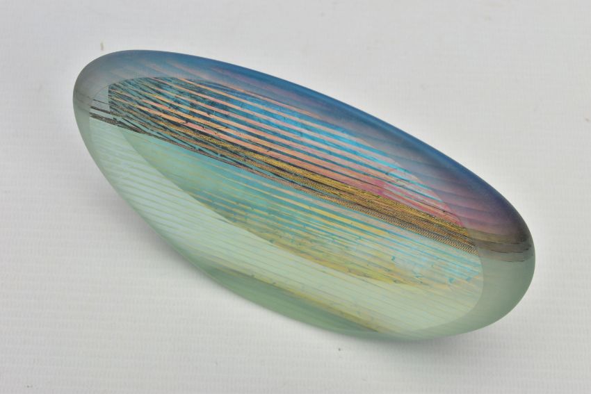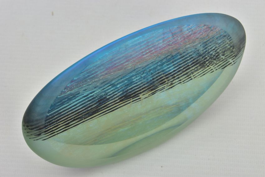 BRIAN BLANTHORN (1957-2012) A DOUBLE FACETED GLASS PEBBLE, composed of multi laminated dichroic and opalescent glass, approximate height 12cm (Condition report: no obvious damage)