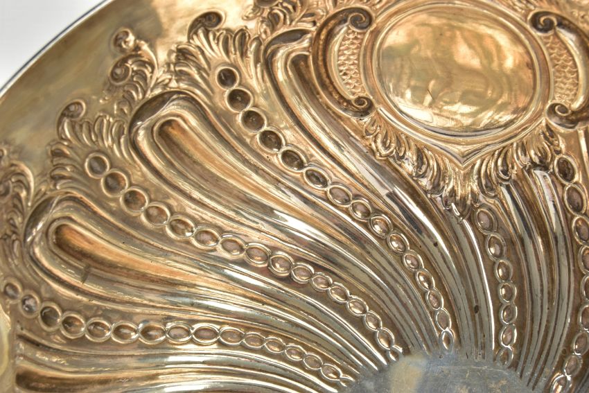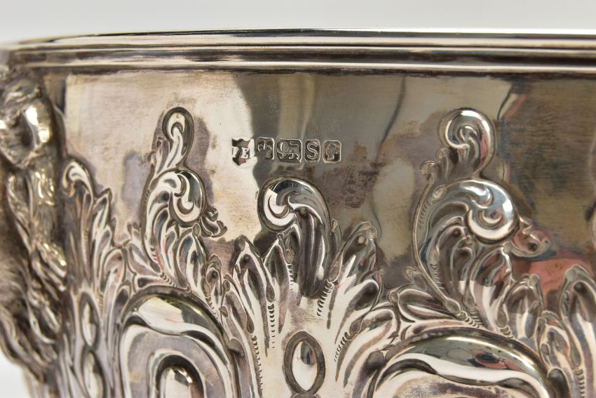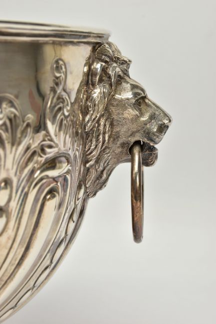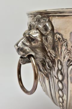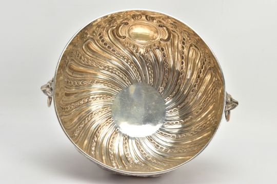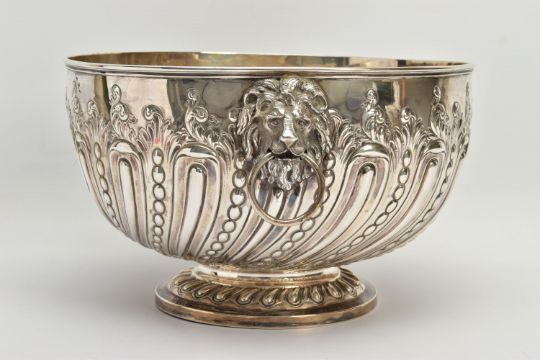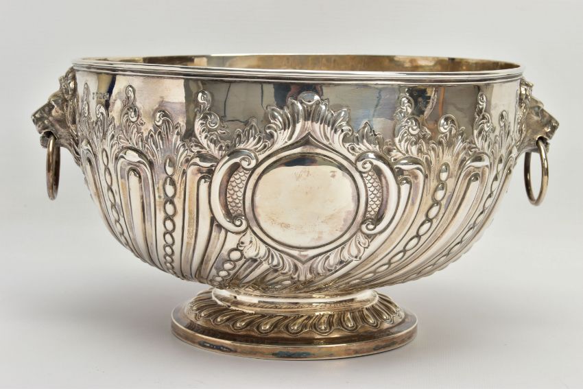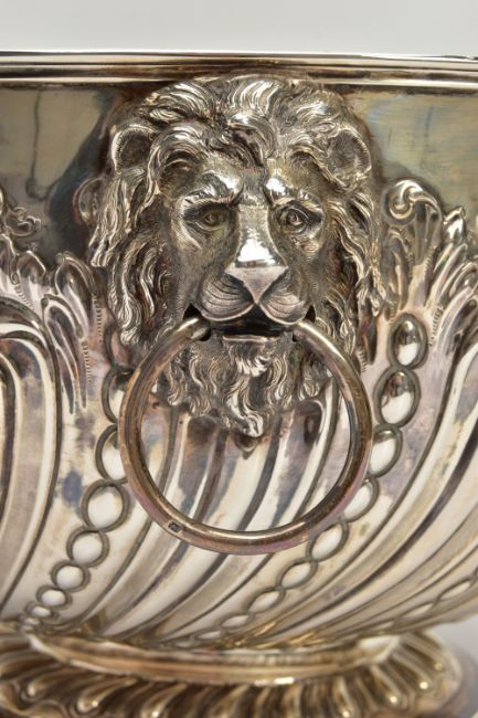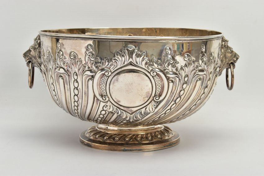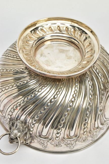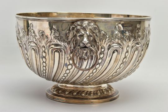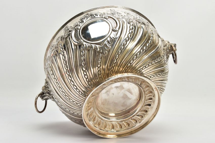 A VICTORIAN SILVER PUNCH BOWL, with cast lion mask and ring handles, the bowl repousse decorated with spiralled gadrooning and beading capped with foliate scrolls, two circular vacant cartouches, on a short pedestal with further spiralled gadrooning, circular foot, maker's mark FE with a shield, probably Frederick Elkington /Elkington & Co, Sheffield 1885, 46.47ozt, 1445,6 grams, diameter 29cm (Condition report: the base isn't sitting level on a flat surface, there is a small crease to the inside of the bowl level with the outer edge of a lion mask, surface scratches to the interior, maker's mark very slightly rubbed)