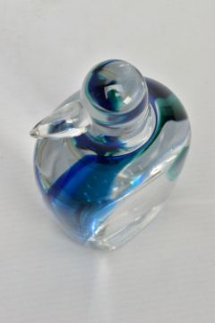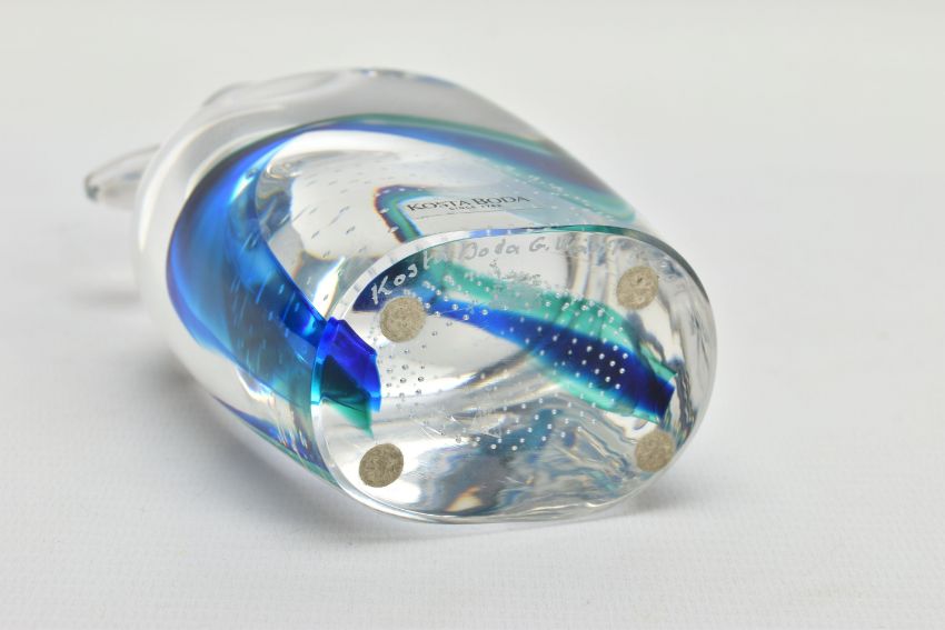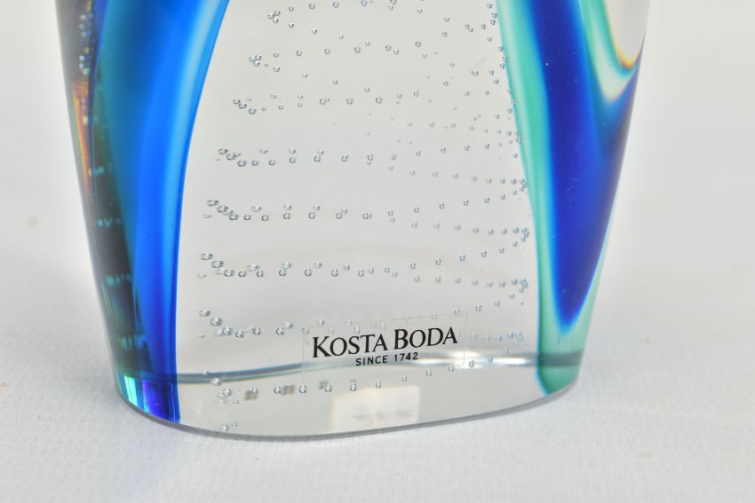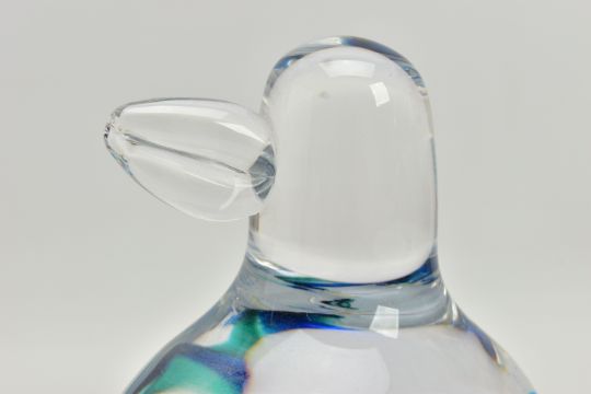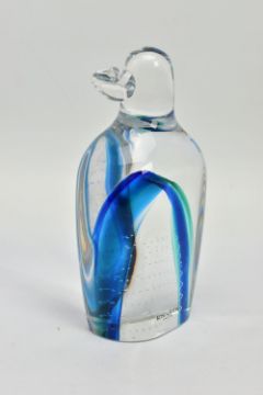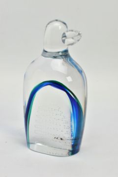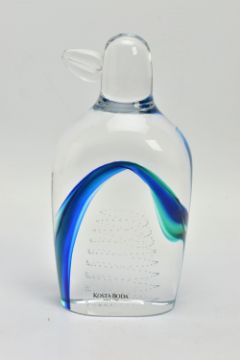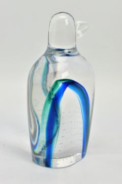 GORAN WARFF FOR KOSTA BODA, a glass penguin paperweight having a green and blue internal stripe and a spiral of controlled air bubbles, signed along with pattern number 99404 to the base, approximate height 15cm (Condition report: no obvious damage but with felt pads to the base)