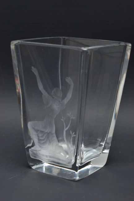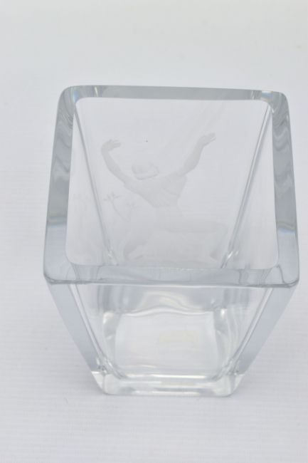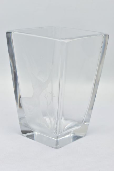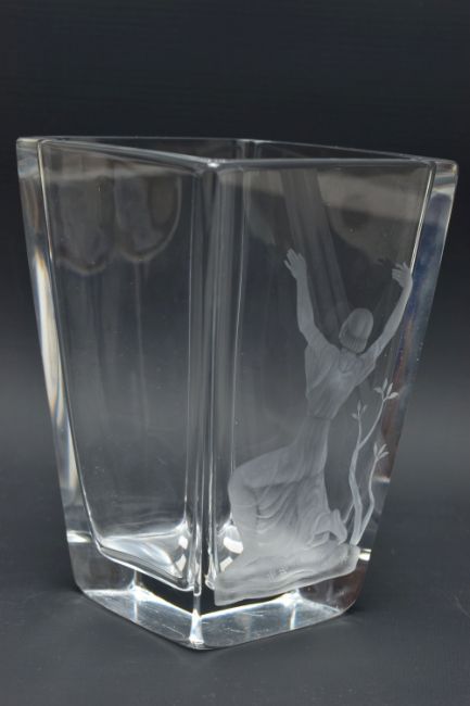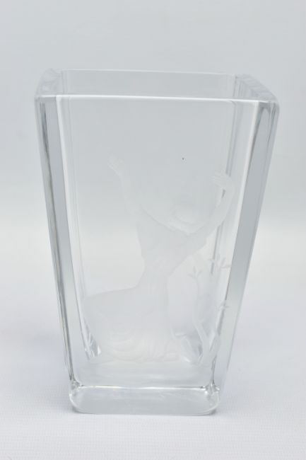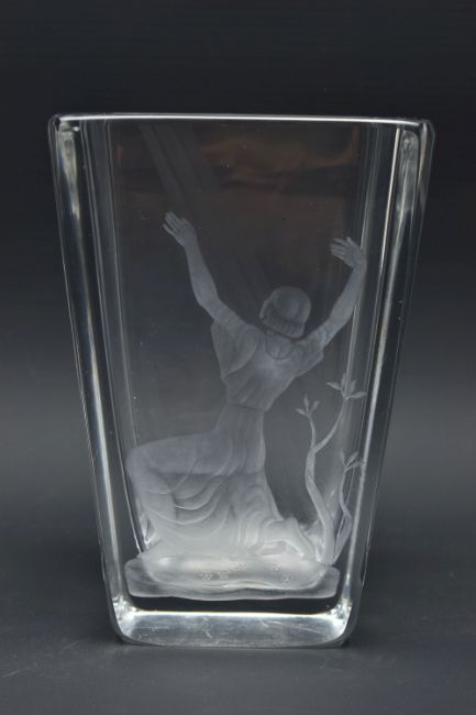 SIMON GATE (1883-1945) FOR ORREFORS, A TAPERING SQUARE FORM VASE, etched to one side with an apostolic figure kneeling while being struck by light, inscribed Orrefors Gate and indistinct numbers to the base, approximate height 16cm (Condition report: small nibble to the edge of the base)