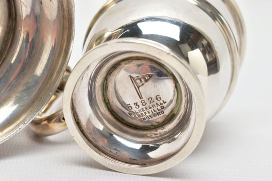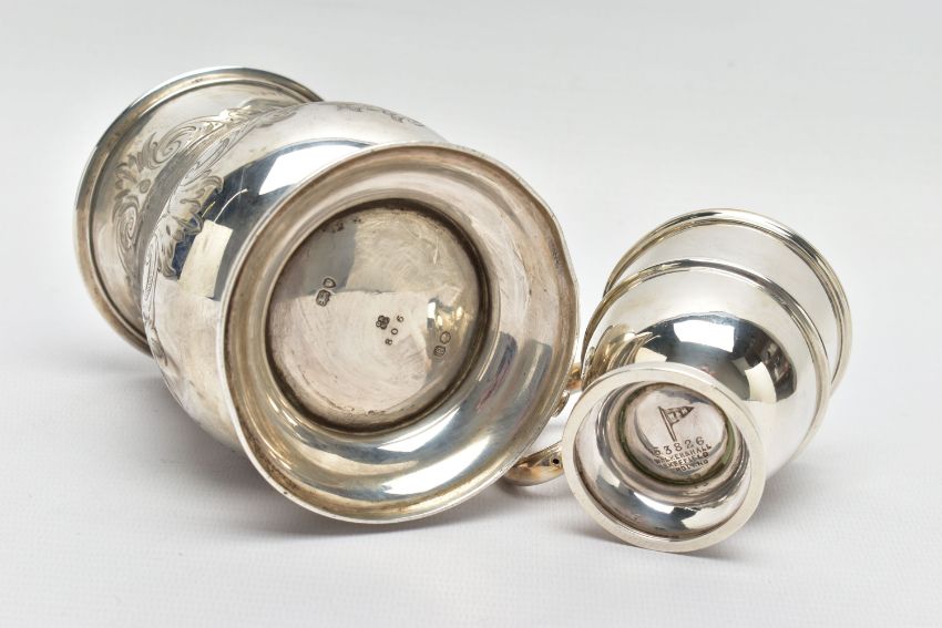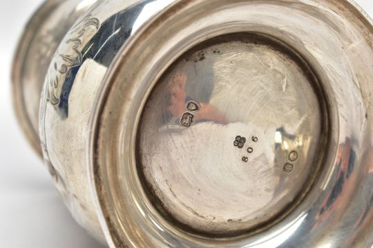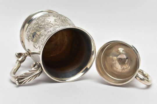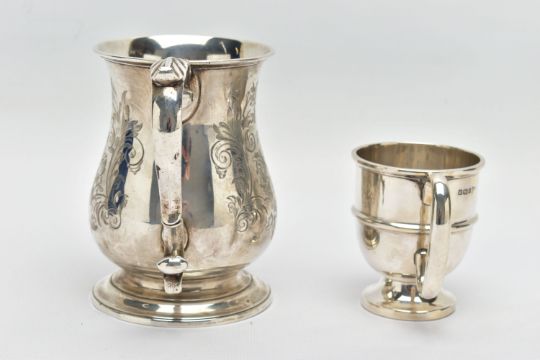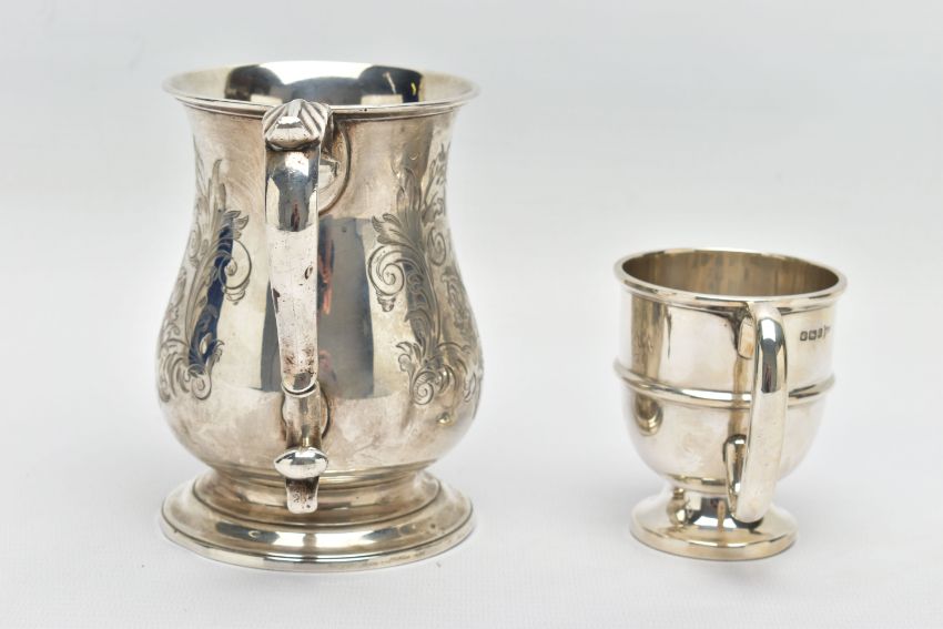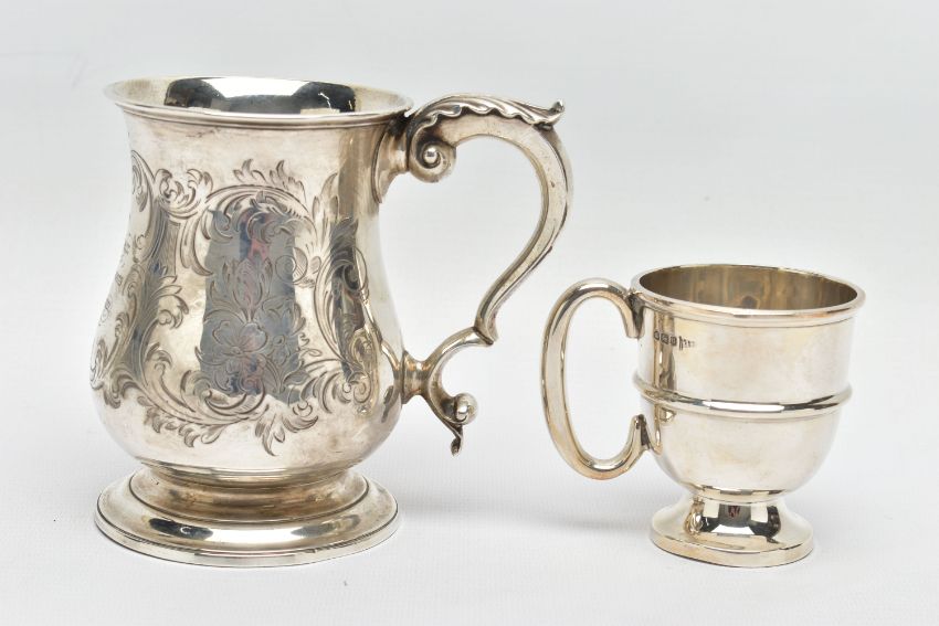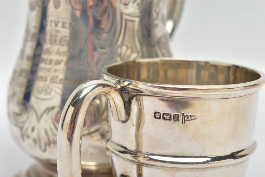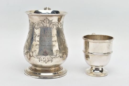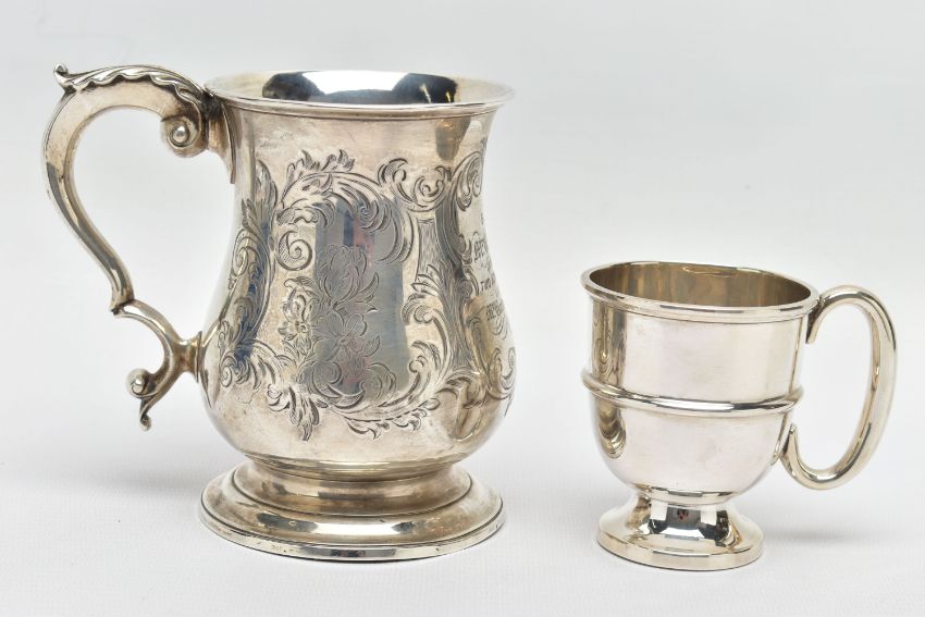 A VICTORIAN SILVER BALUSTER TANKARD, S scroll handle with leaf shaped thumb rest, foliate engraved body and bears presentation inscription 'GIVEN TO Mr G.B. Essex for the best TWO ACRES OF ROOTS GROWN WITH Mr. Gorden's Manure 1861', worn gilt interior, stepped circular foot, makers George John Richards & Edward Charles Brown, London 1861, 7.77ozt, 241.5 grams, height 12cm, together with an Edwardian silver christening mug, C scroll handle, central girdle to body, short pedestal, circular foot, makers Walker & Hall, Sheffield 1908, 2.46ozt, 76.6 grams (2) (Condition report: tankard has a slightly uneven foot, wear to the gilding, the christening mug also has an uneven foot and misshapen top rim)