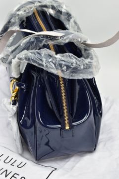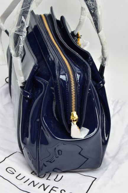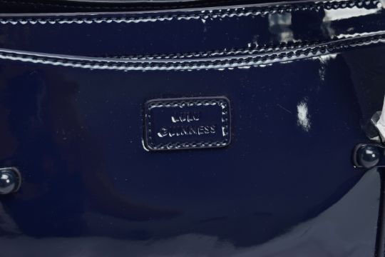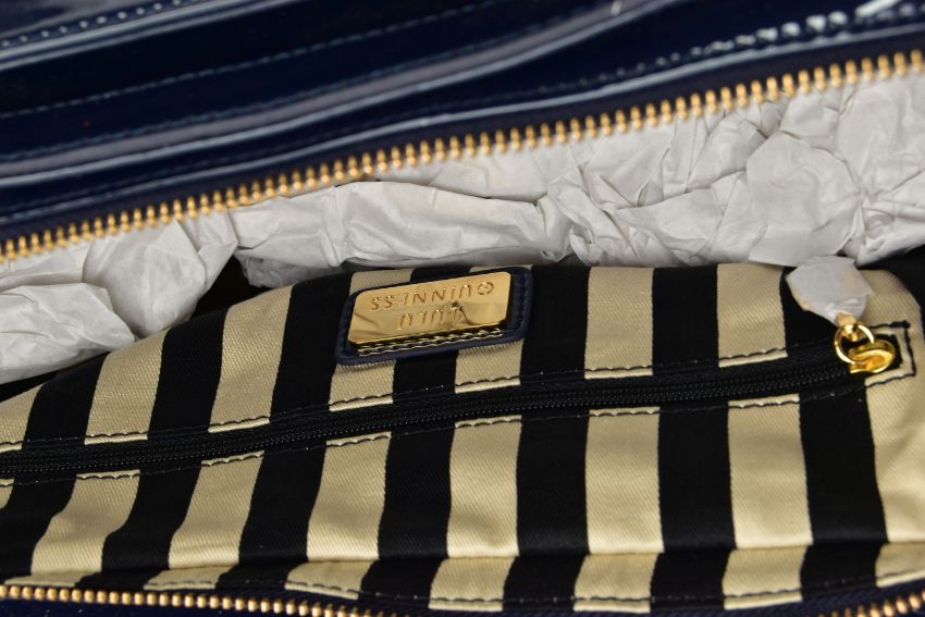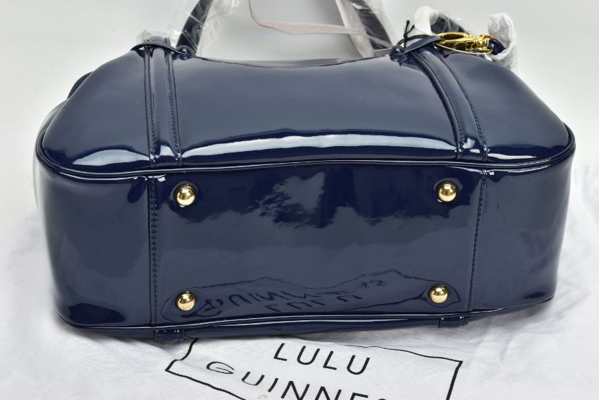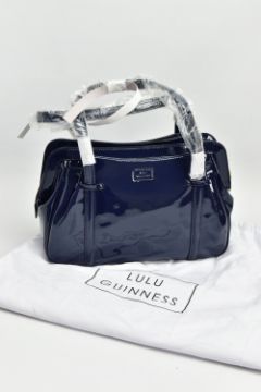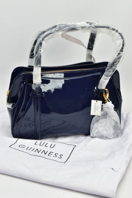 AN UNUSED LULU GUINNESS 'FRANKA' PATENT LEATHER MIDNIGHT BLUE HANDBAG, striped black and stone fabric interior, tag attached, handles and zips retain covering, height 20.5cm x width 33cm x depth 15cm, with fabric dust bag (Condition report: some light dust in folds, a few light scuff marks to patent finish)