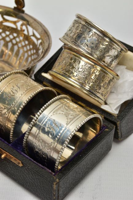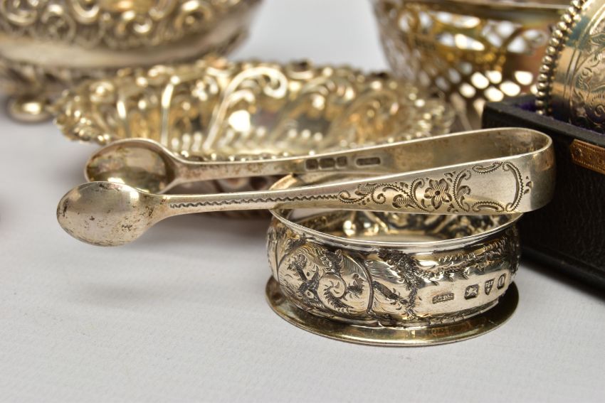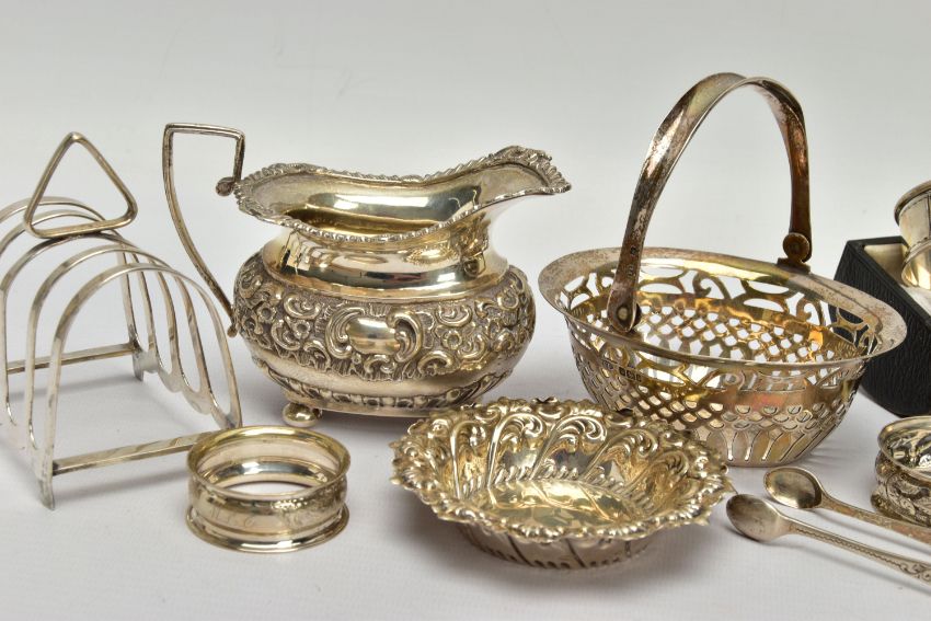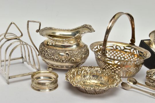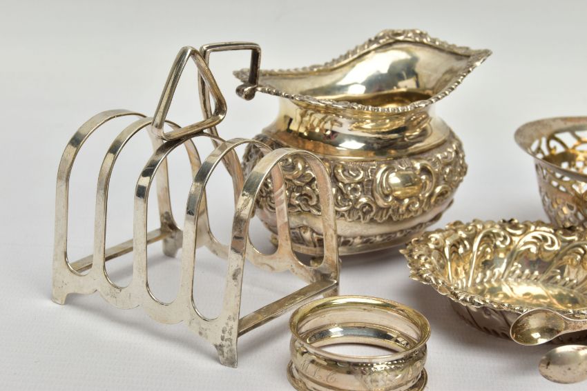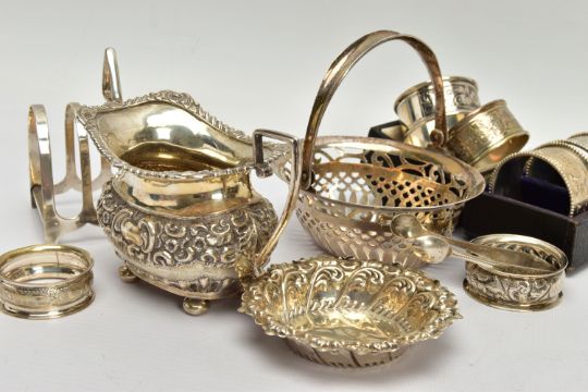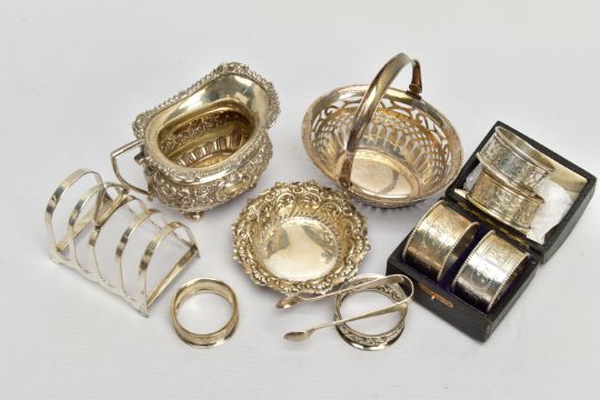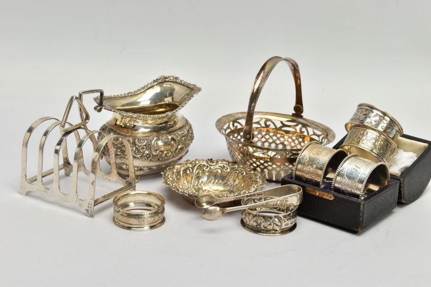 A PARCEL OF VICTORIAN AND 20TH CENTURY SILVER, comprising an Edwardian oval bon bon basket with swing handle and pierced decoration, makers Levesley Brothers, Sheffield 1903, an Edwardian cream jug with repousse decoration, on four flattened bun feet, worn gilt interior, makers George Nathan & Ridley Hayes, Chester 1902, a George VI five bar toast rack, an Edwardian circular nut dish with repousse decoration, a cased pair of Victorian circular napkin rings, engraved initials to cartouches, Birmingham 1888, four other circular napkin rings and a pair of sugar tongs, gross weight 12.12ozt, 377 grams (10) (Condition report: generally in useable condition, toast rack bars are slightly misaligned)
