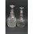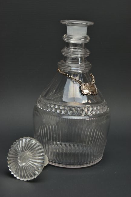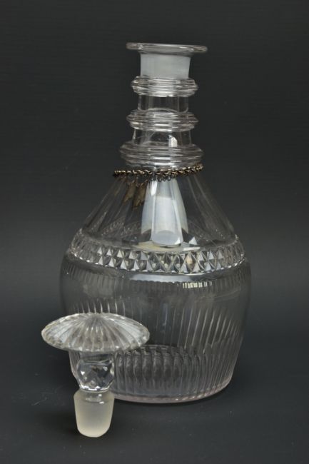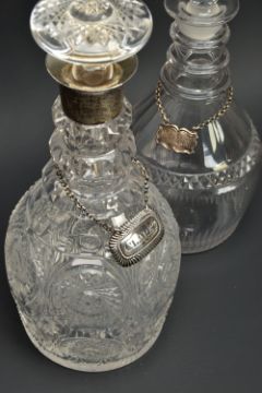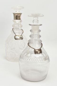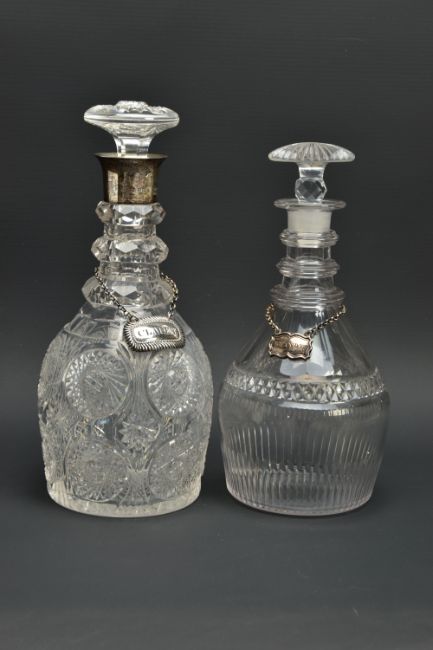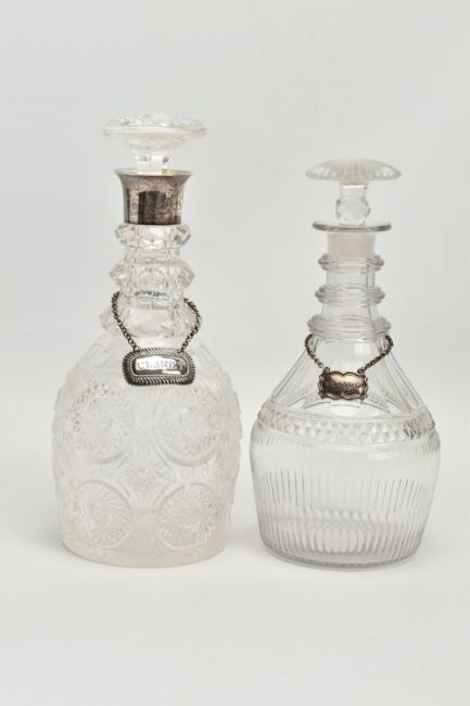 AN EARLY 19TH CENTURY PRUSSIAN SHAPED GLASS DECANTER AND A GEORGE V GLASS DECANTER, the early 19th century example with mushroom stopper and triple ring neck, facet and hobnail cut decoration, height 25cm, with a Victorian 'BRANDY' decanter label, maker William Summers, London 1864, 0.30ozt, 9.2 grams, the George V decanter with mushroom stopper, silver mounted collar, hallmarked Mappin & Webb, 17487, Birmingham 1911, over a facet cut triple ring neck and profusely cut body, height 27cm, with an unmarked 'CLARET' decanter label, probably 19th century silver (4 and with receipt of purchase of the Mappin & Webb decanter and the Claret label from The London Silver Vaults) (Condition report: 19th century decanter, the stopper has a sizeable chip and on close inspection quite a number of flea bites and small chips, the decanter has several tiny chips to the edges around the lower band of facets, the Mappin & Webb decanter has a chip to the top of the stopper, a few very tiny chips around the bottom edge, the top ring has a chip and a few minor nibbles to some of the cut edges, both labels are in good condition)