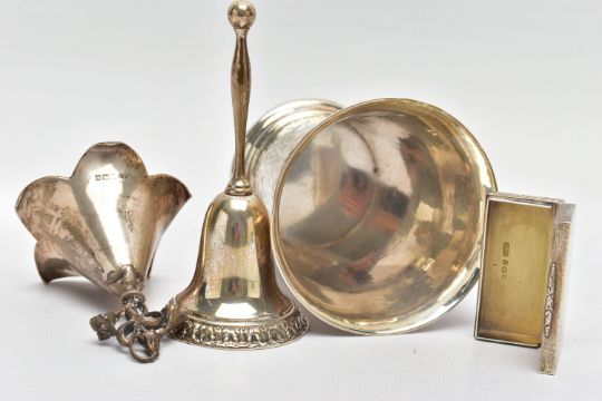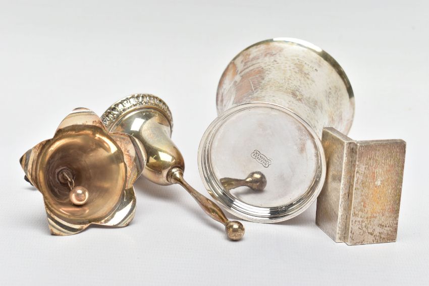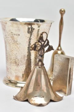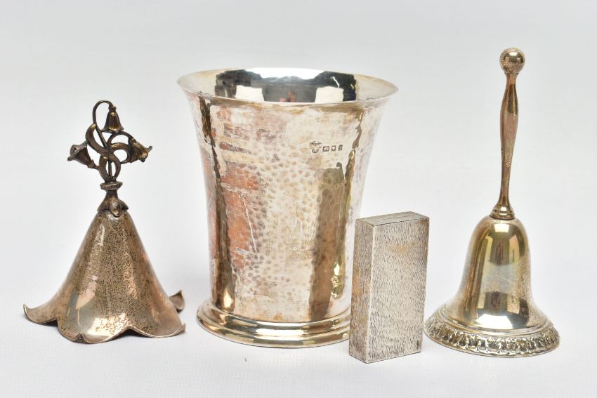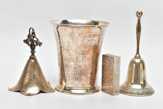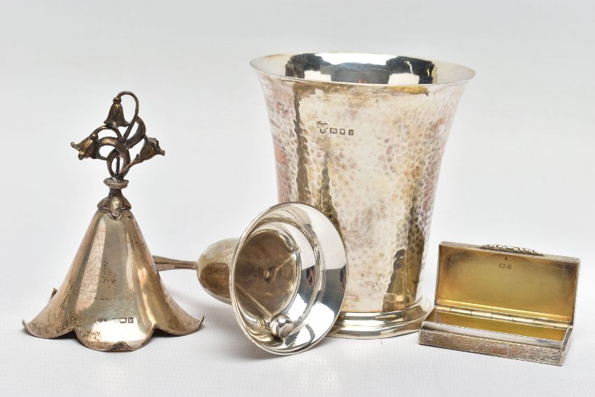 FOUR PIECES OF 20TH CENTURY SILVER, comprising a George V beaker, hand hammered finish, retailed by Harrods, maker Harrods Ltd (RWB), London 1924, 3.76ozt, 116.8 grams, height 9.1cm an Elizabeth II snuff box of rectangular form with bark effect decoration, gilt interior, makers Salloways Ltd, Birmingham 1979, 1.41ozt, 44 grams, width 5cm and two table bells, one of traditional form, importer's mark for CM Co, Birmingham 1904, height 11cm the other of flower head form with cast bluebell style handle, makers Turner & Simpson, Birmingham 1971, height 8.5cm, gross weight 9.48ozt, 294.8 grams (4) (Condition report: all pieces in usable condition, some rubbing to hallmarks, beaker foot very slightly misshapen)