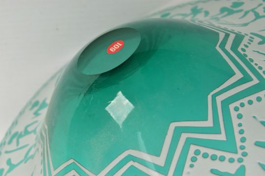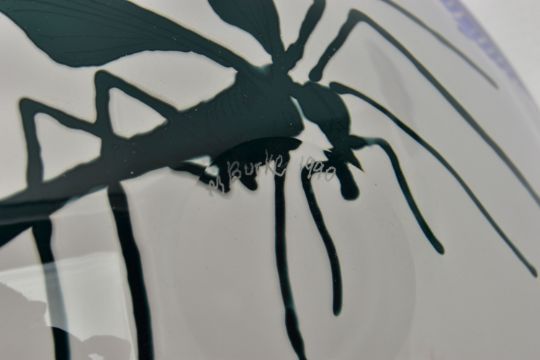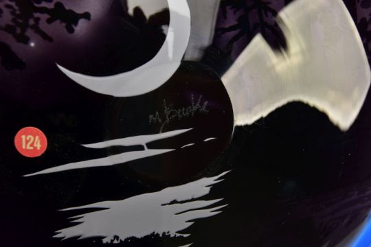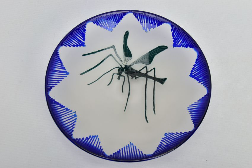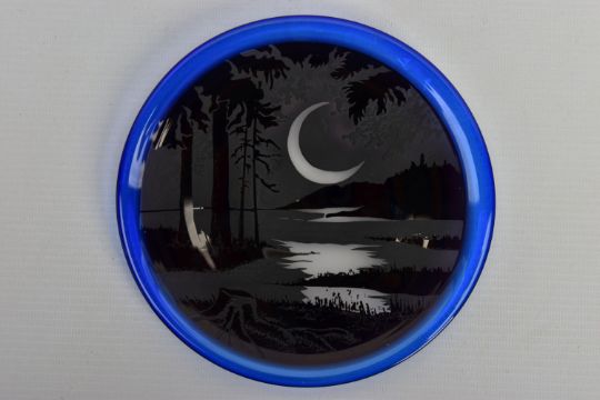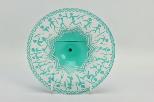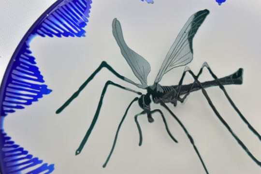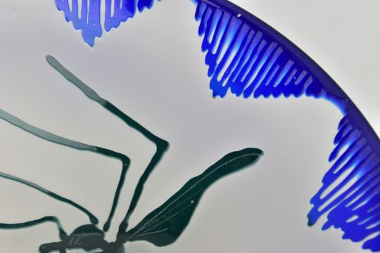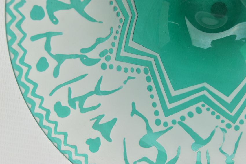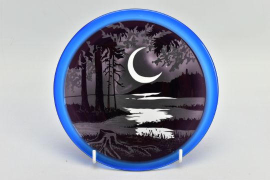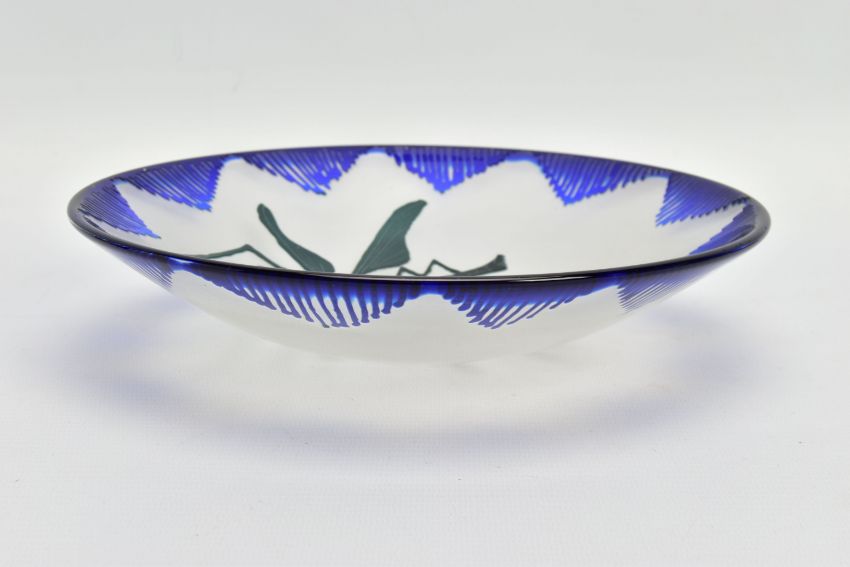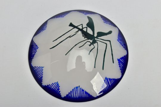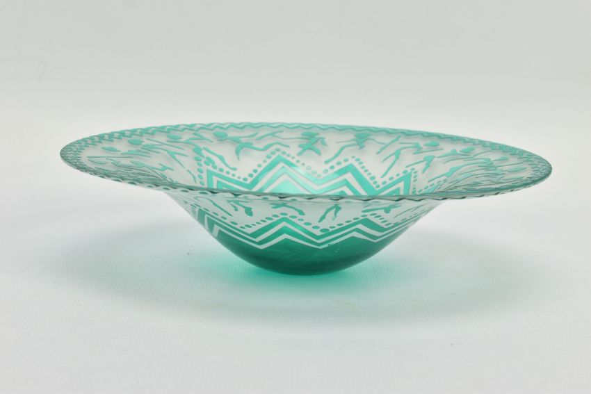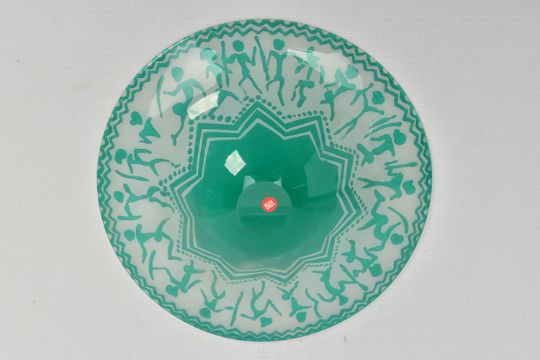 MARGARET BURKE (BRITISH CONTEMPORARY) THREE PIECES OF ETCHED GLASS, comprising a shallow bowl etched with a crane fly design, approximate diameter 22cm, a green and white bowl having etched caveman figures to the rim, approximate diameter 19cm, and a small plate with monochrome etched landscape decoration, all signed to the underside (3) (Condition report: no obvious damage)