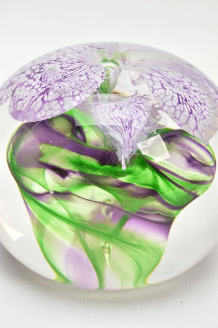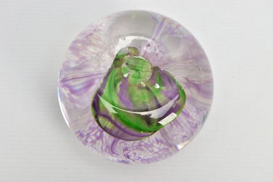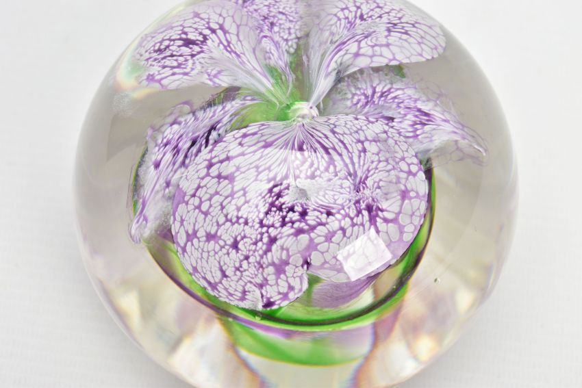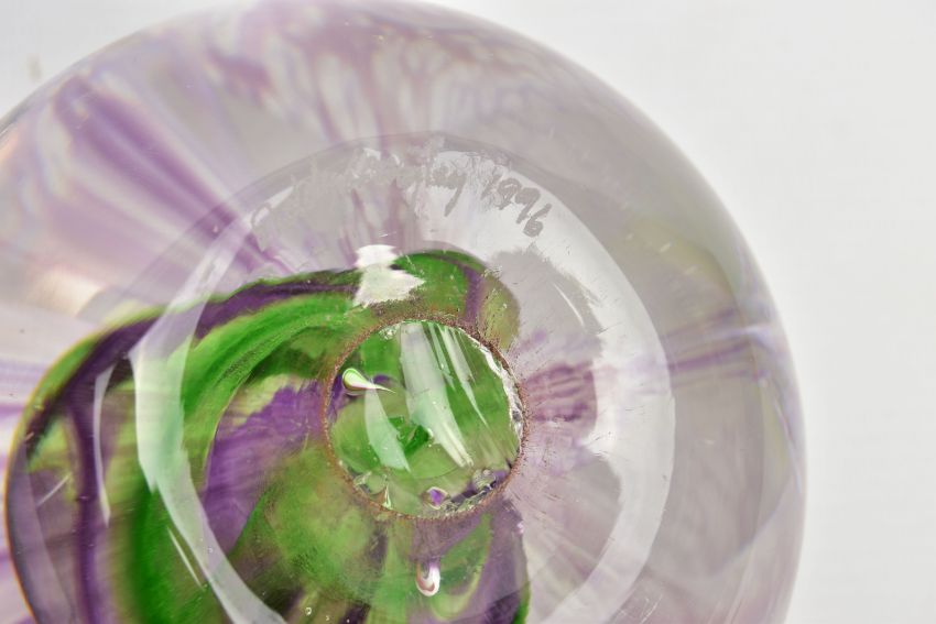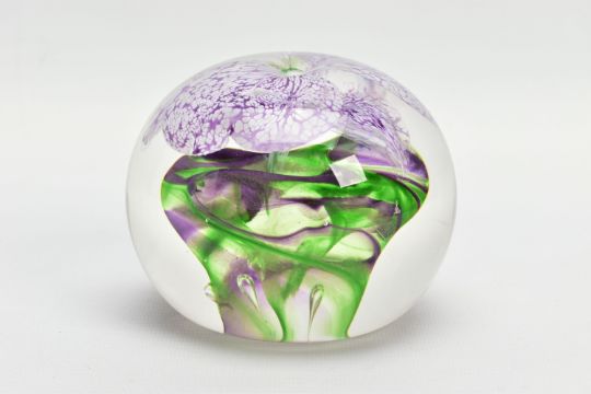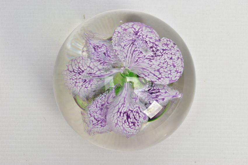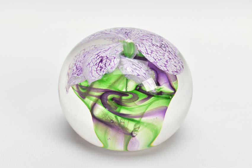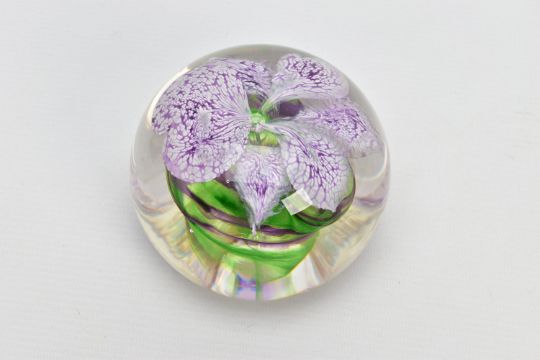 SIDDY LANGLEY (BRITISH CONTEMPORARY) AN ORCHID DESIGN GLASS PAPERWEIGHT, signed and dated 1996 to the base, approximate height 9cm (Condition report: small bubble inclusions in places but no obvious damage)
