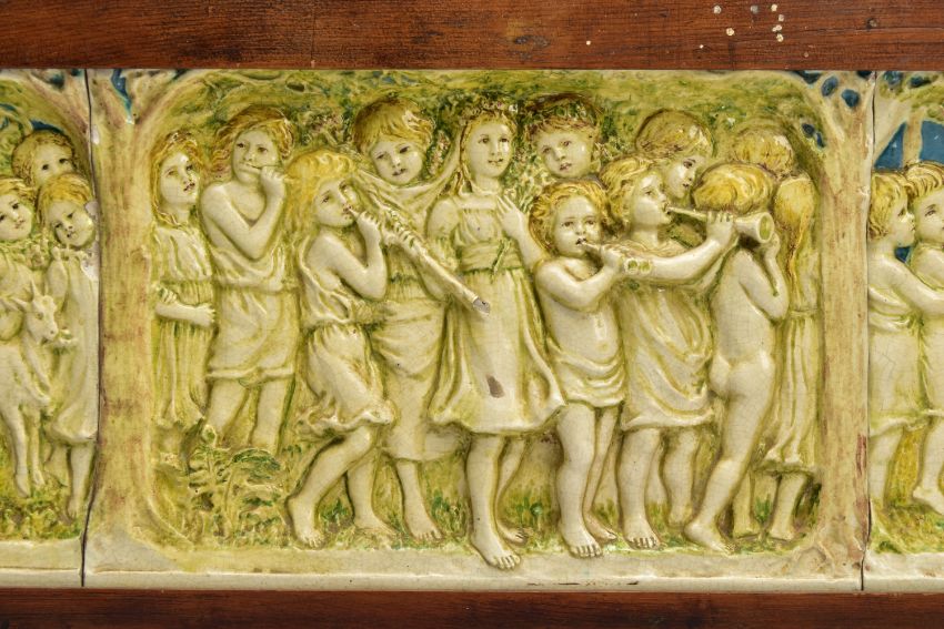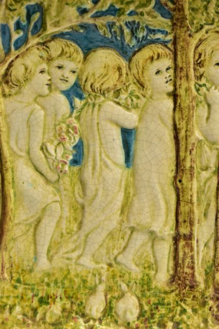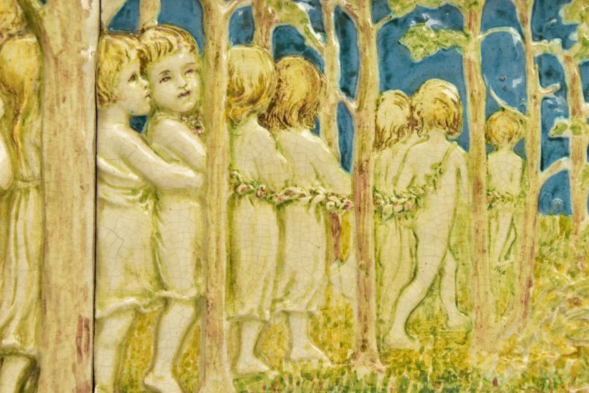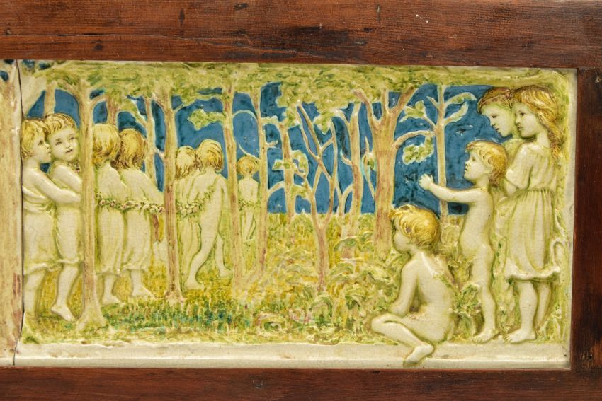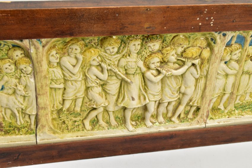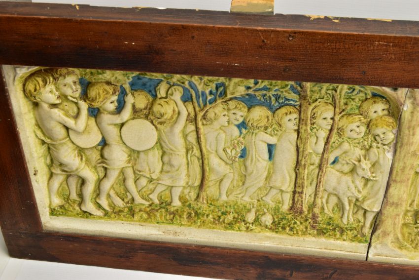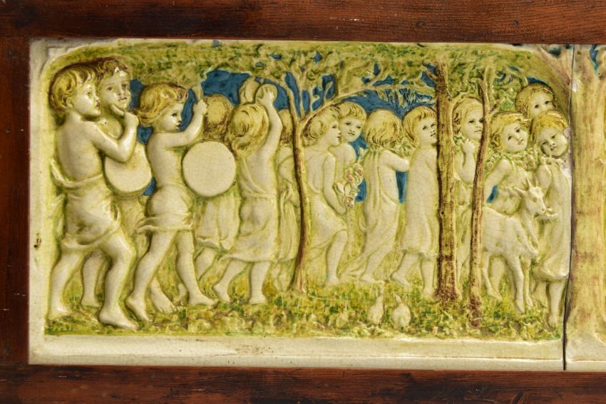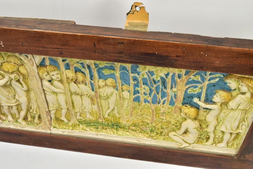 A DELLA ROBBIA THREE SECTION RECTANGULAR PLAQUE MOULDED IN RELIEF WITH A PROCESSION OF CHILDREN THROUGH A WOODLAND SETTING, in possibly after a design by Ellen Mary Rope and decorated by Marianne de Caluwe, the plaques fitted in rectangular stained pine frame and the reverse of each plaque incised with 1, 2 and 3 within a circle and the end plaques impressed with the Della Robbia mark with 1901, the centre panel faintly painted with 'M d C', internal measurements height 25cm x width 126.3cm, external dimensions height 36.3cm x width 137.6cm x depth 6.3cm (Condition report: the glazed front is crazed throughout, left hand panel has losses where it abuts the centre panel, the centre panel has a glaze chip to the top of the tree trunk on the left hand side, to the end of the pipe and a dress in the centre and a small chips to the top and bottom of the tree trunk on the right hand side, the right hand plaque looks to be in a better state, all three panels are very dusty, the plaque has not been taken out of the frame therefore the edges have not been inspected and cannot be guaranteed, the frame has evidence of there having been further wall brackets, several small chips to the back of the plaques but no major damage noted)