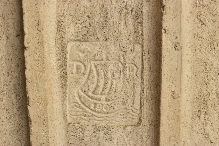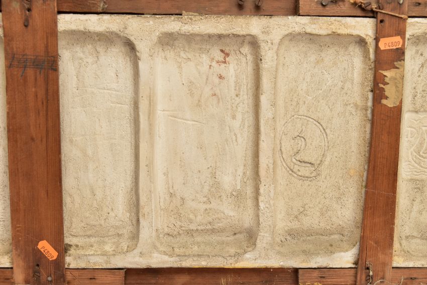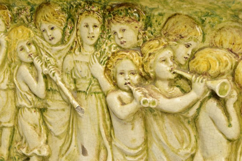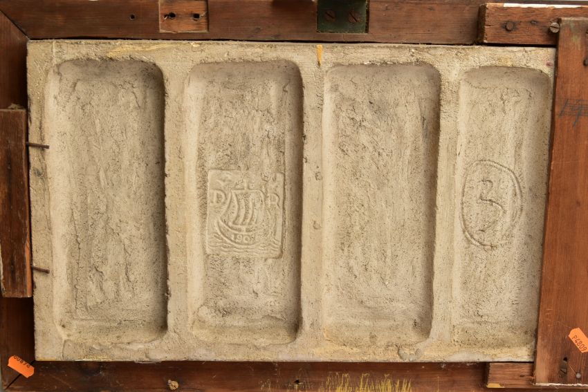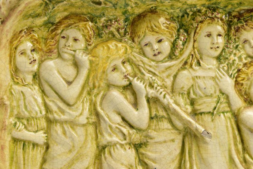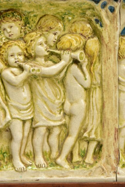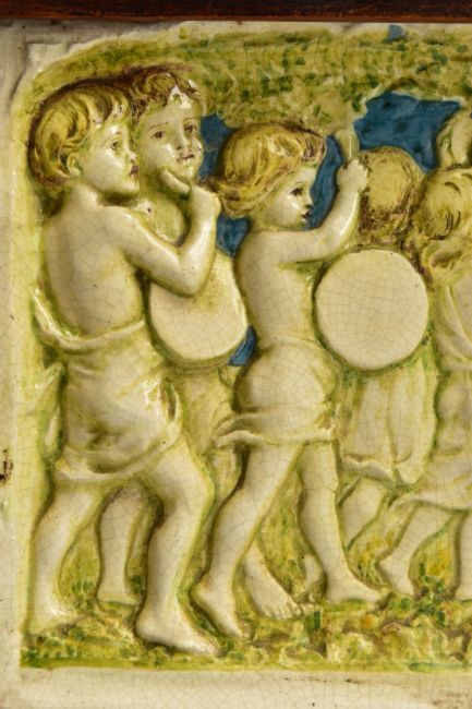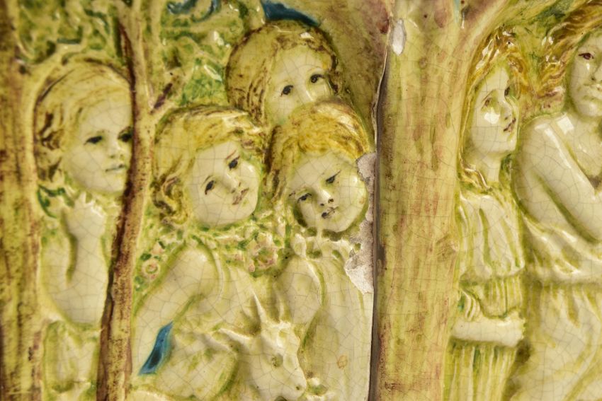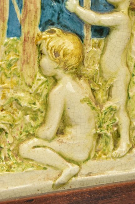 A DELLA ROBBIA THREE SECTION RECTANGULAR PLAQUE MOULDED IN RELIEF WITH A PROCESSION OF CHILDREN THROUGH A WOODLAND SETTING, in possibly after a design by Ellen Mary Rope and decorated by Marianne de Caluwe, the plaques fitted in rectangular stained pine frame and the reverse of each plaque incised with 1, 2 and 3 within a circle and the end plaques impressed with the Della Robbia mark with 1901, the centre panel faintly painted with 'M d C', internal measurements height 25cm x width 126.3cm, external dimensions height 36.3cm x width 137.6cm x depth 6.3cm (Condition report: the glazed front is crazed throughout, left hand panel has losses where it abuts the centre panel, the centre panel has a glaze chip to the top of the tree trunk on the left hand side, to the end of the pipe and a dress in the centre and a small chips to the top and bottom of the tree trunk on the right hand side, the right hand plaque looks to be in a better state, all three panels are very dusty, the plaque has not been taken out of the frame therefore the edges have not been inspected and cannot be guaranteed, the frame has evidence of there having been further wall brackets, several small chips to the back of the plaques but no major damage noted)