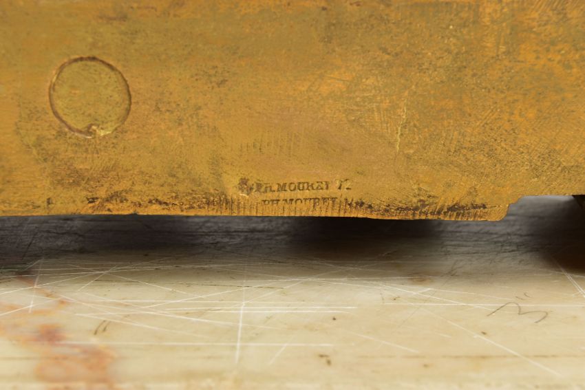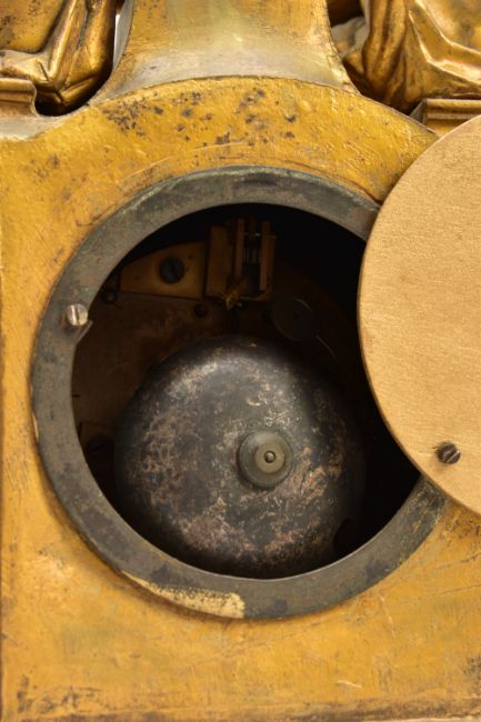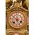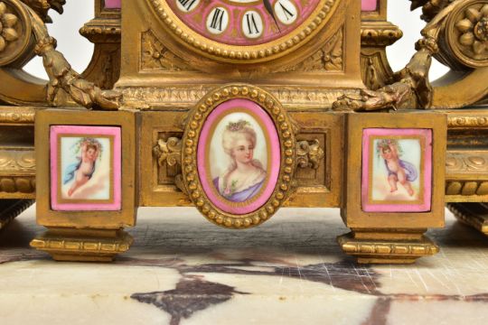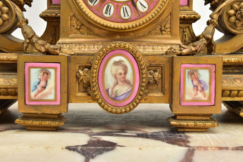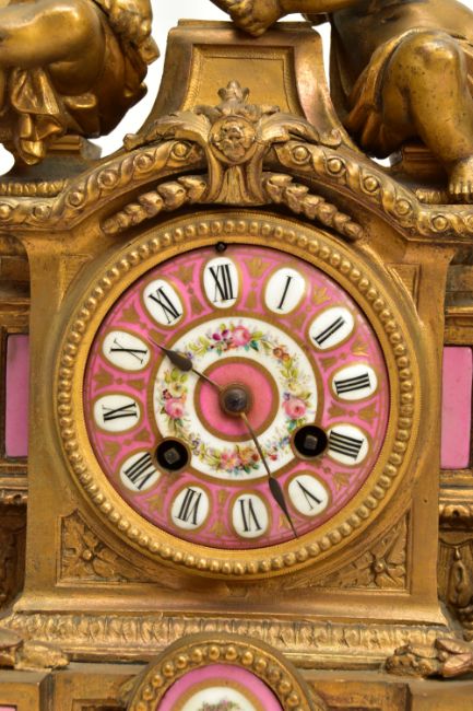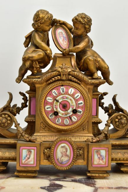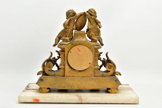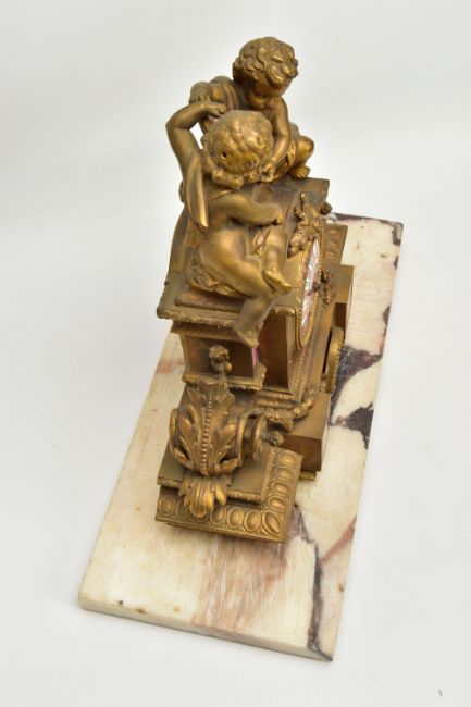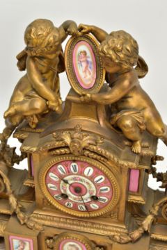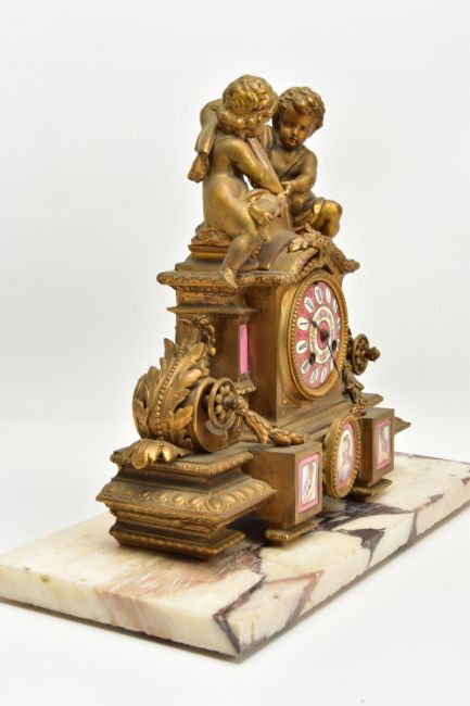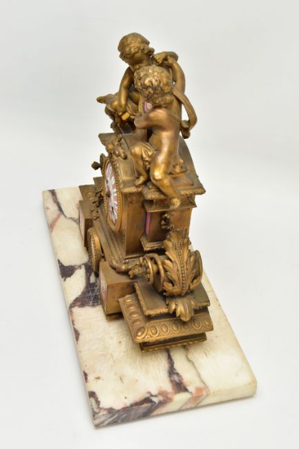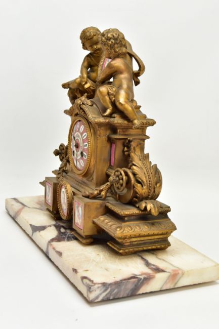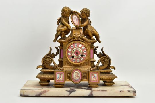 A MID 19TH CENTURY FRENCH GILT METAL AND PORCELAIN MOUNTED FIGURAL MANTEL CLOCK, the case surmounted with two putti, one of which holds an oval porcelain panel painted with a cherub, the circular porcelain dial with pink and gilt ground and black Roman numerals, eight day movement by J Marti numbered 2149MF, bell strike, the lower case with foliate scroll sides , the front inset with three porcelain panels, on two rectangular plinth feet, the rear or the case stamped P.H. Mourey, height 33.5cm together with a separate rectangular marble stand, 46cm x 20.2cm x 2.8cm (2) (Condition report: no key or pendulum, movement is overwound, cherubs on the case are in need of tightening, some wear to the gilding)