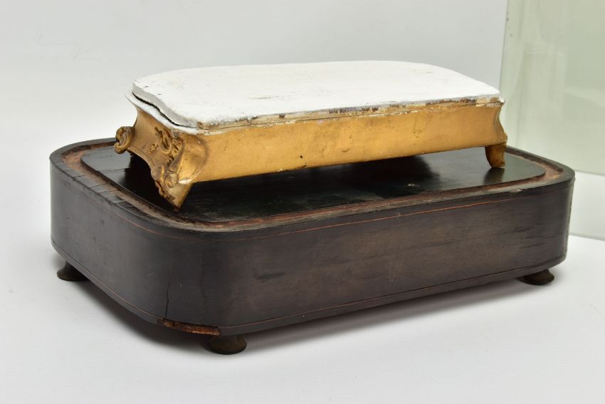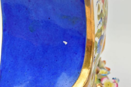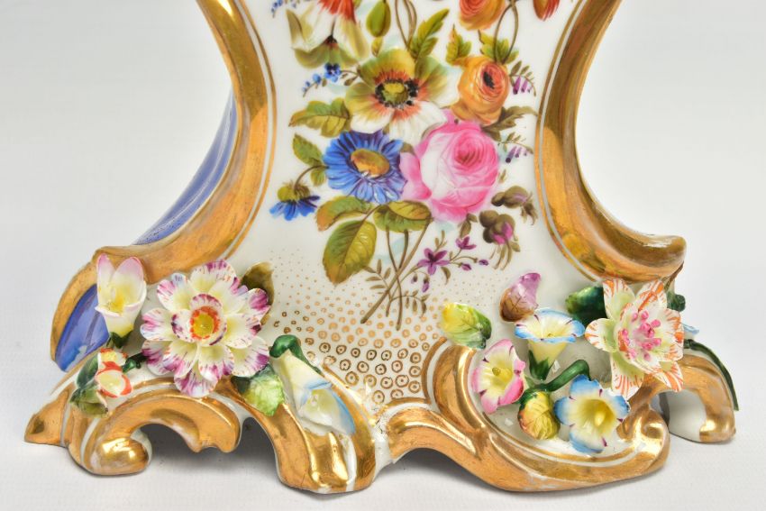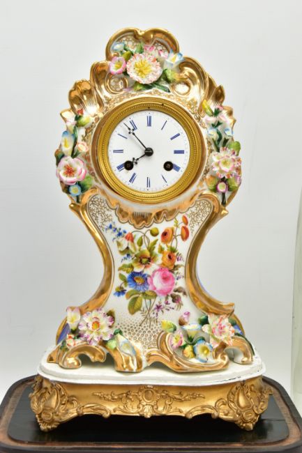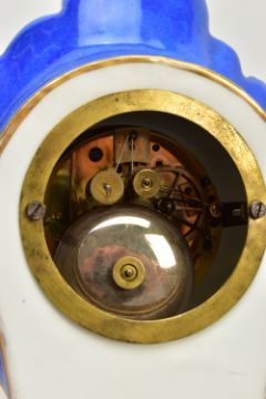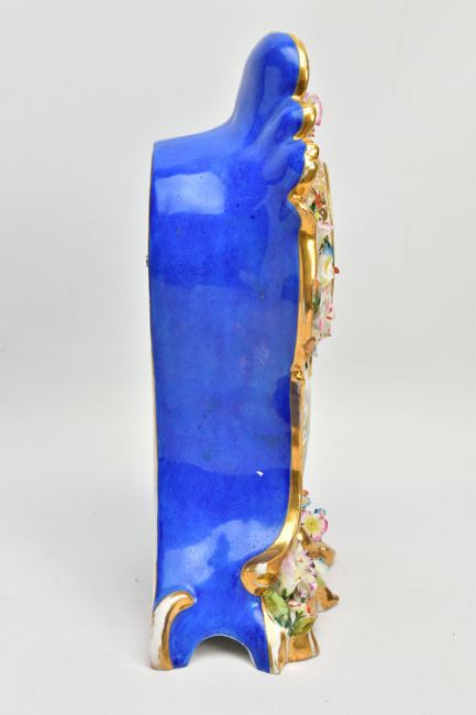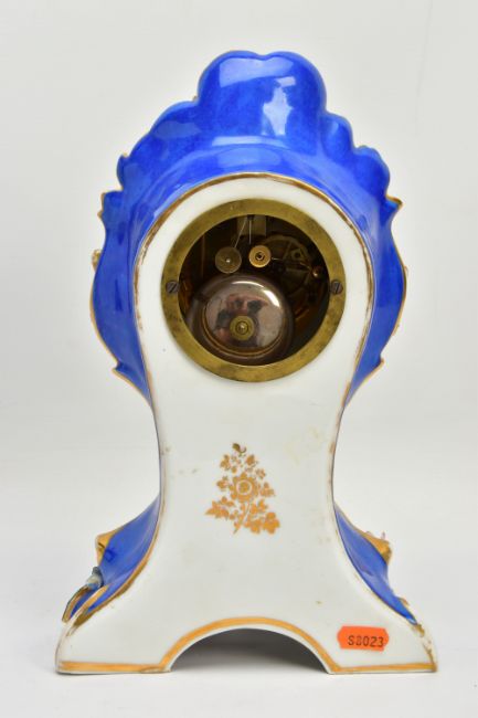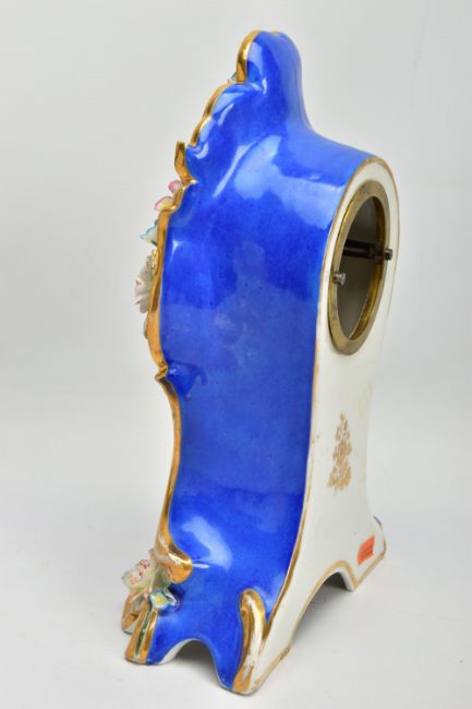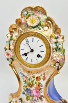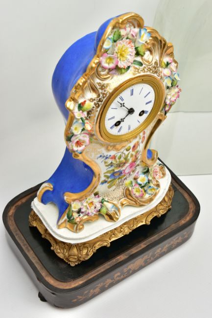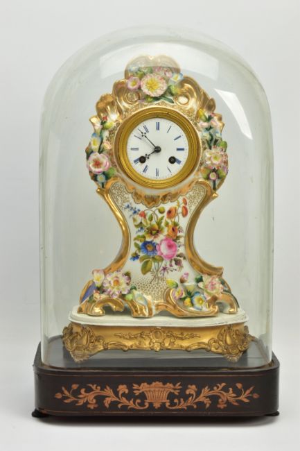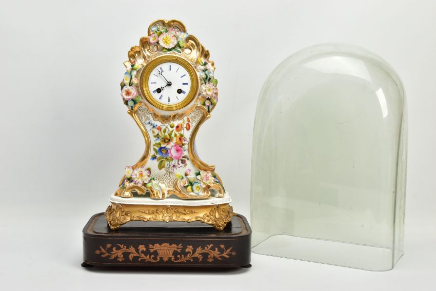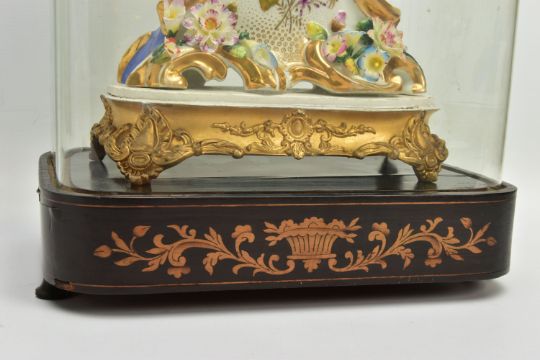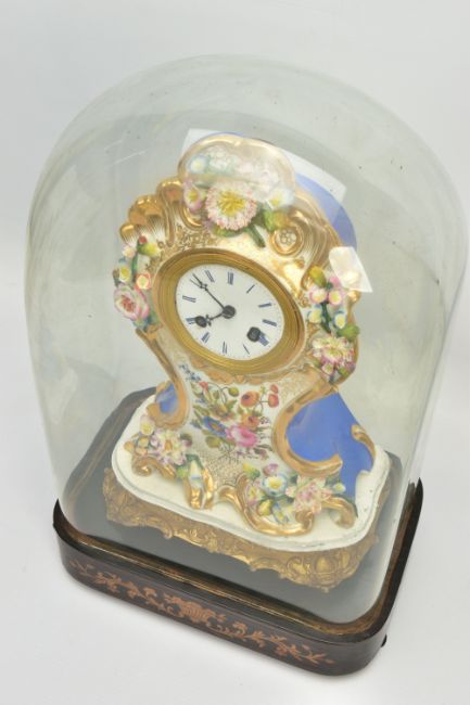 A LATE 19TH CENTURY FRENCH PORCELAIN CASED MANTEL CLOCK OF ROCOCO STYLE, enamel dial with blue Roman numerals, eight day movement with bell strike, movement stamped S. Marti, the case with blue glazed sides, hand painted with a floral spray below the dial, with pendulum, comes with a giltwood stand and a 19th Century glass dome on an ebonised and inlaid rectangular base with four turned feet, height of clock 31cm, overall height 46cm (Condition report: no key, clock winds, chimes but three hours behind, firing crack at the front bottom edge which is visible, some chipping around winding holes, a number of the flower petals are chipped, the gilding is worn in places, the glass dome has a 2cm long x 0.5cm high chip on the bottom edge , the ebonised stand has cracks, splits and veneer loss)