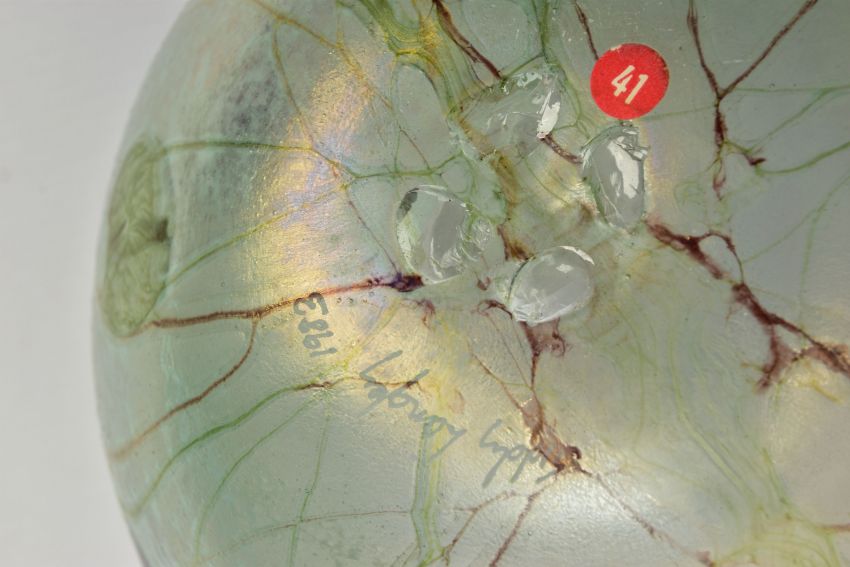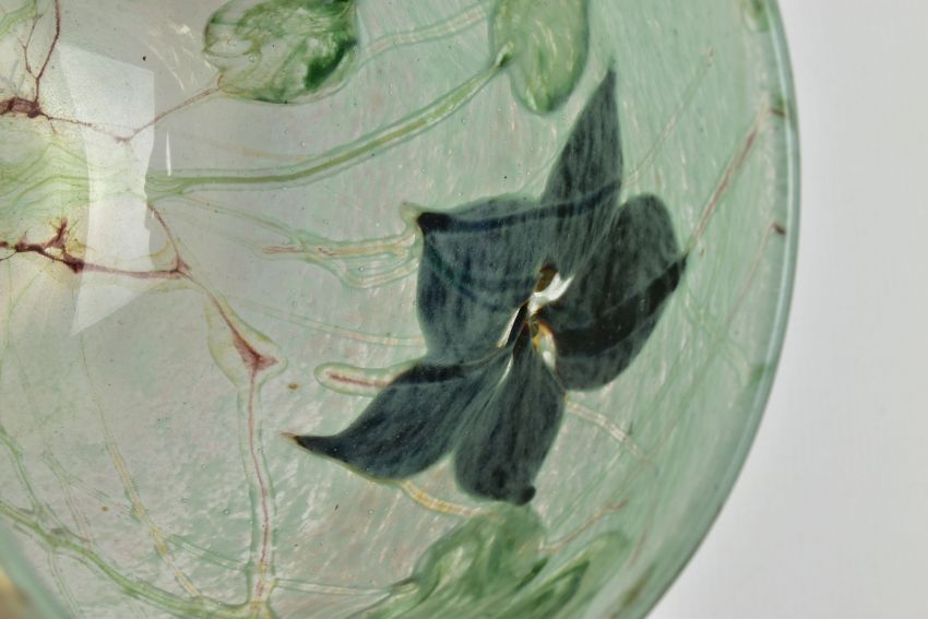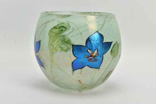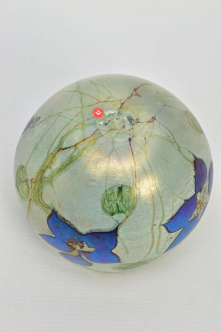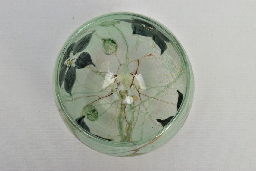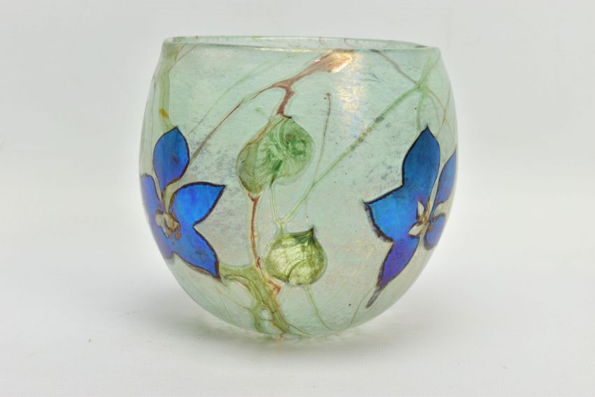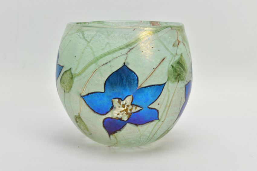 SIDDY LANGLEY (BRITISH CONTEMPORARY) A STUDIO GLASS BOWL DECORATED WITH BLUE FLOWERS AND FOLIAGE, signed and dated 1983, approximate height 14cm (Condition report: no obvious damage)