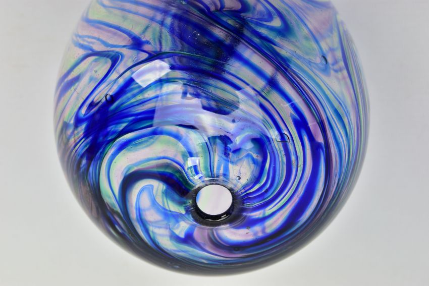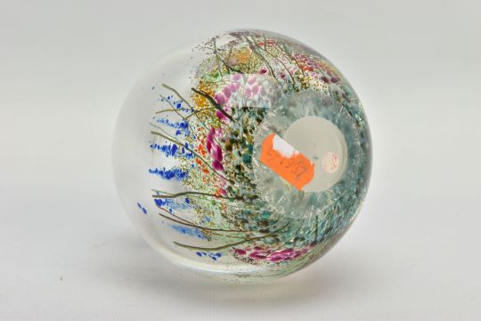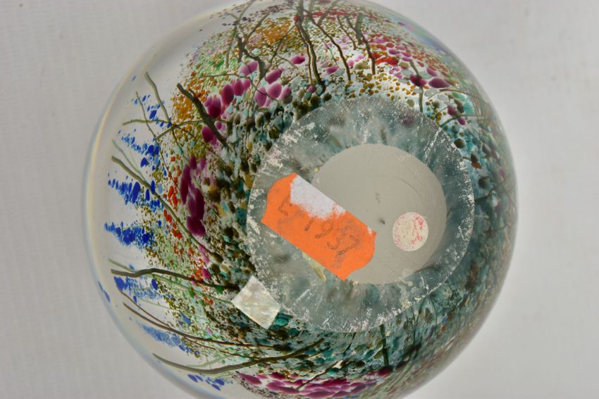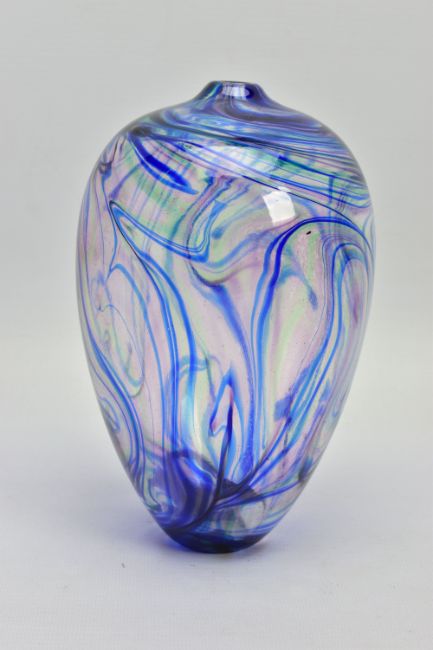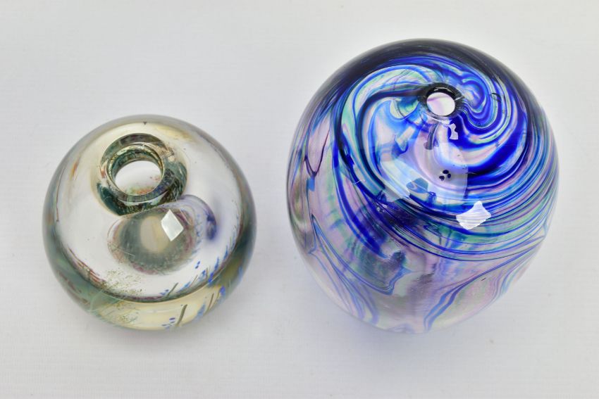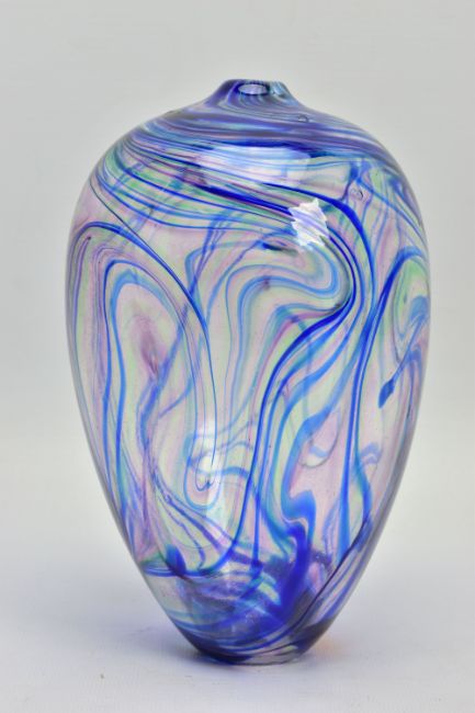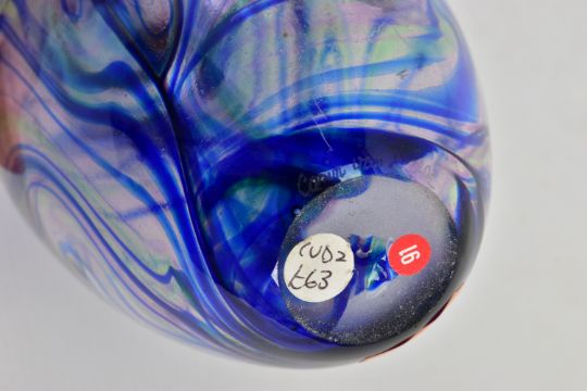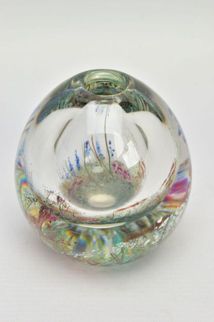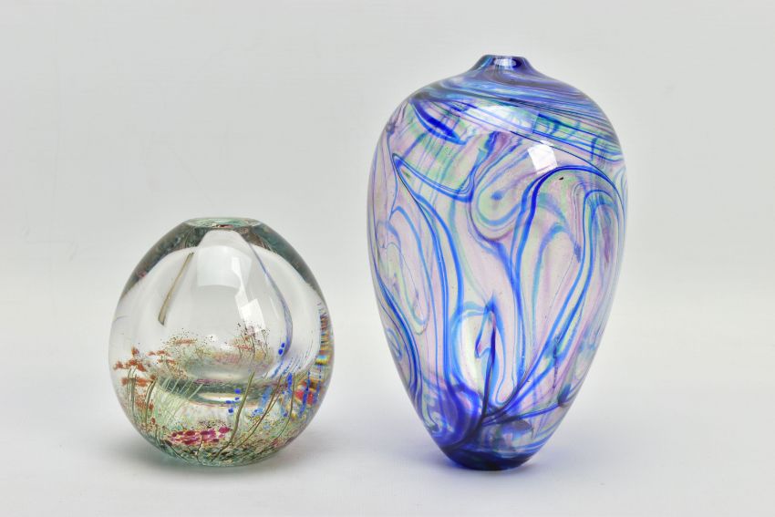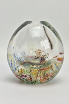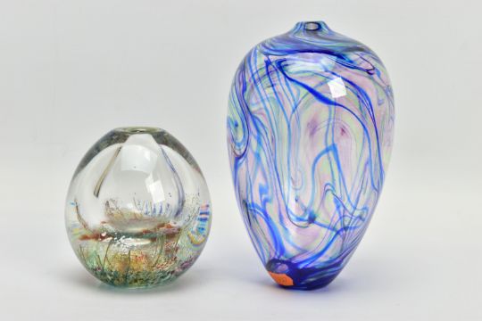 TWO PIECES OF LATE 20TH CENTURY STUDIO GLASS, comprising a Carin Von Drehle (American contemporary) ovoid case with streaky decoration, signed to the bottom edge, approximate height 19cm and a William Walker Graal vase with a wild flower decoration, signed and dated '89, approximate height 11cm (Condition report: no obvious damage)