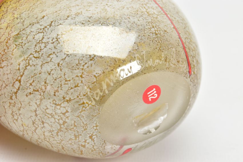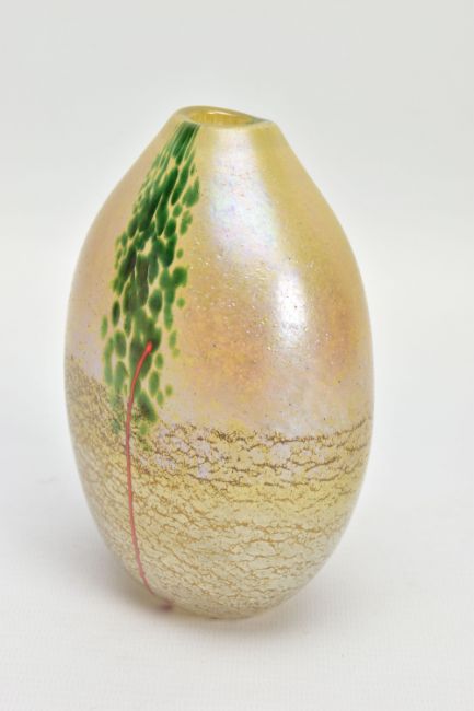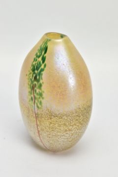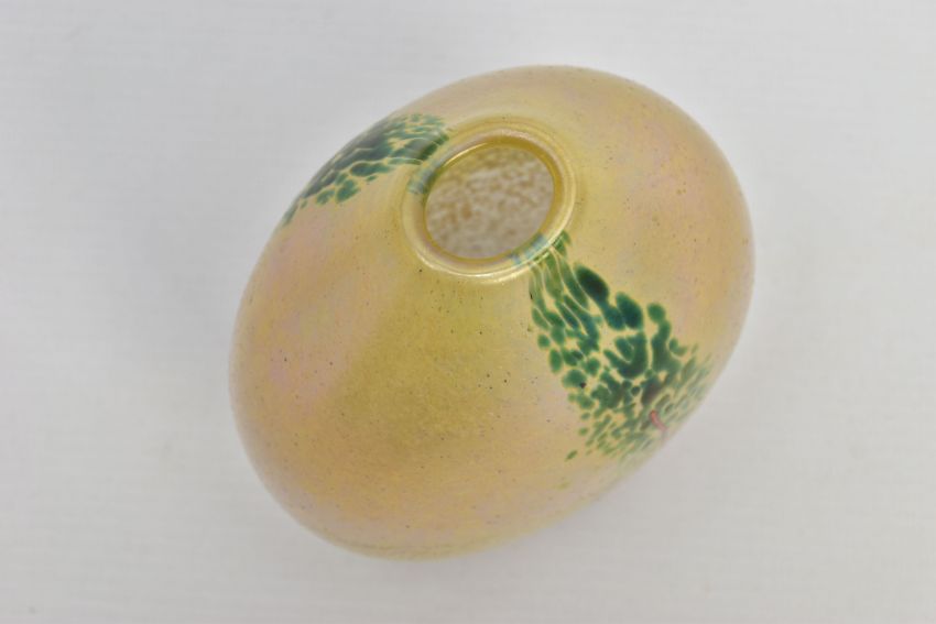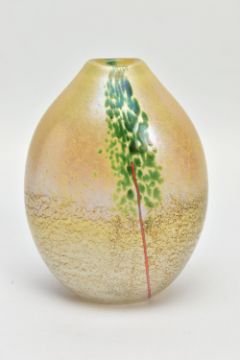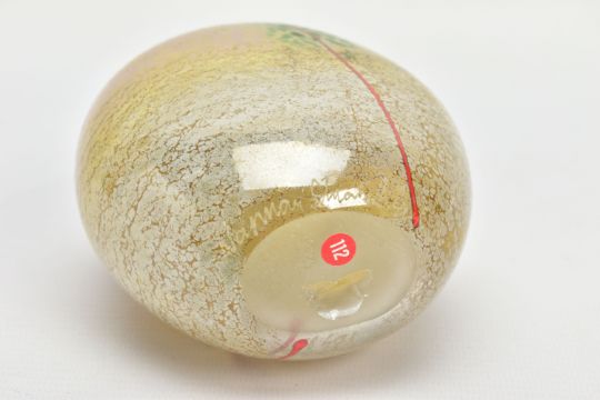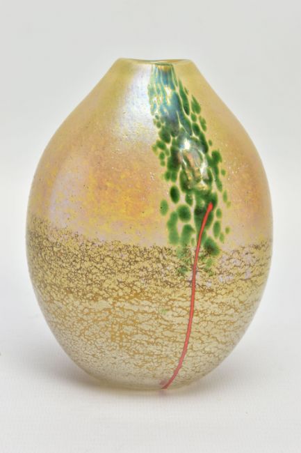 NORMAN STUART CLARKE (BRITISH 1946) A GLASS VASE OF COMPRESSED OVAL FORM, a mottled iridescent body with mottled green strips and orange stripes to either side, signed and dated PBG 85 to the bottom edge, approximate height 13cm (Condition report: no obvious damage)
