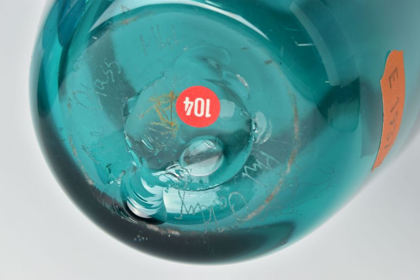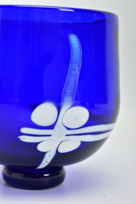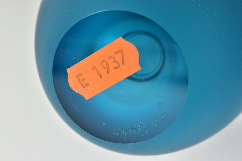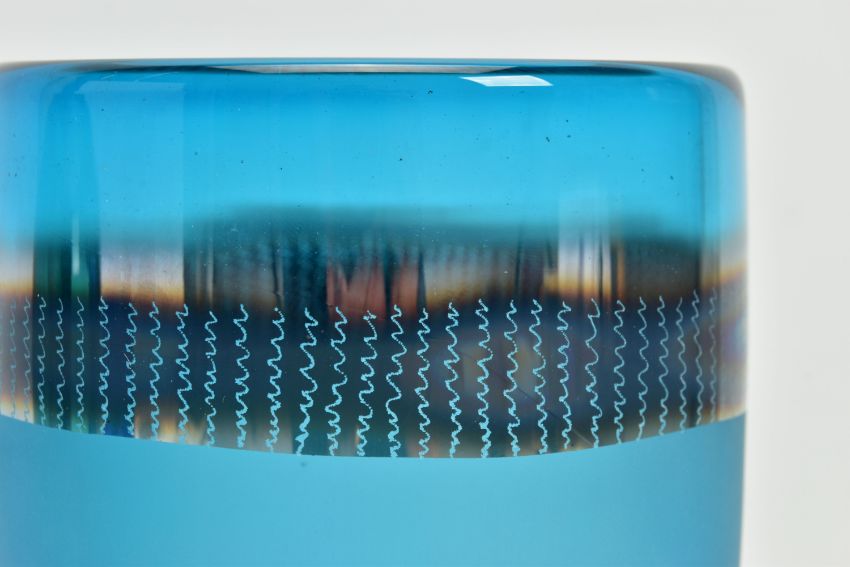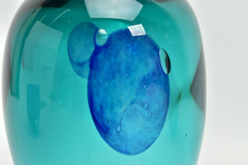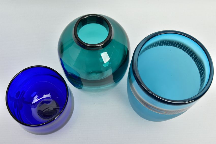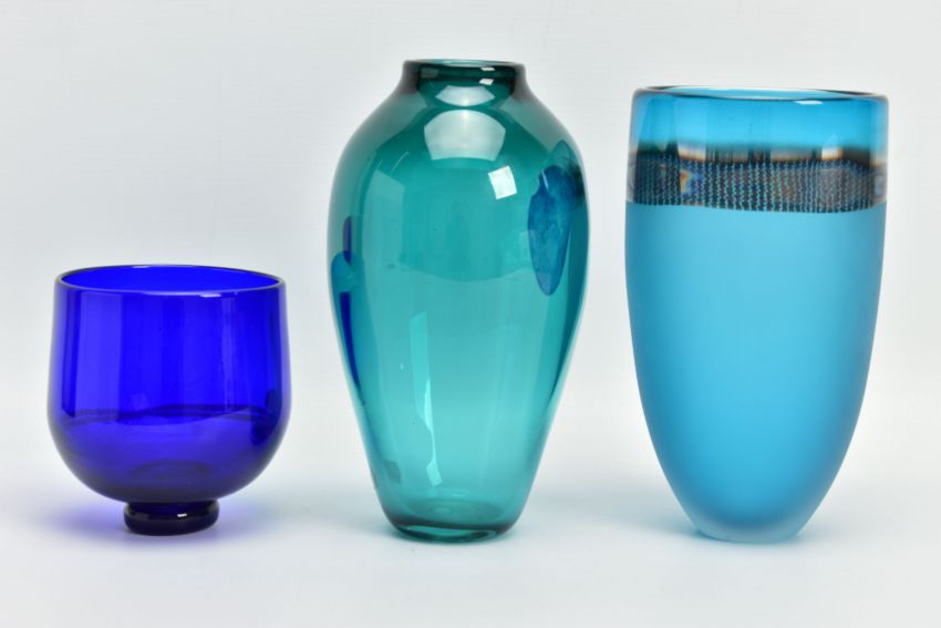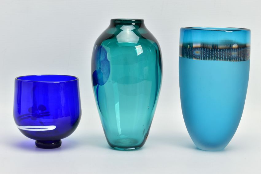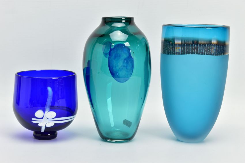 THREE PIECES OF LATE 20TH CENTURY BRITISH STUDIO GLASS, comprising a Phil Oakly green glass vase with blue spot and bubble inclusions, inscribed to the base, approximate size 21cm, Jane Charles matt and gloss blue vase, signed to the base, approximate height 20cm and a Lee Cartlidge deep blue vase with white abstract motif, unsigned, approximate height 11cm (3) (Condition report: no obvious damage)