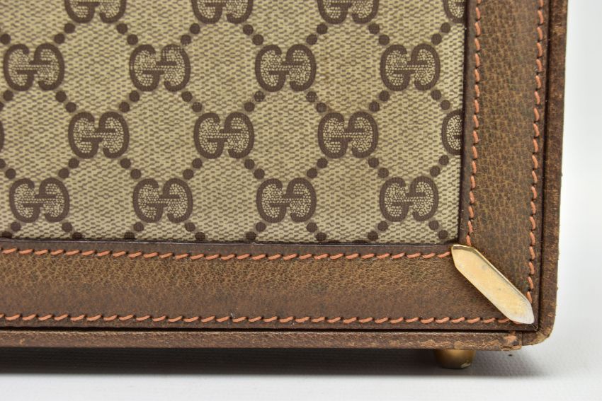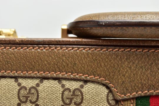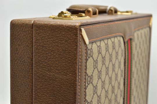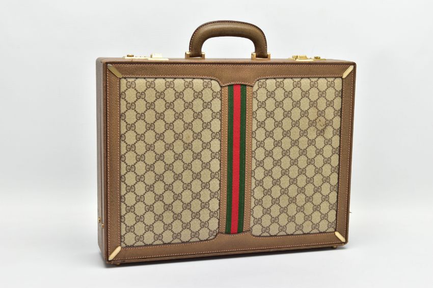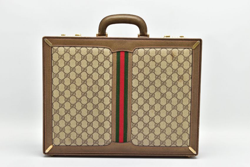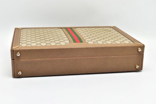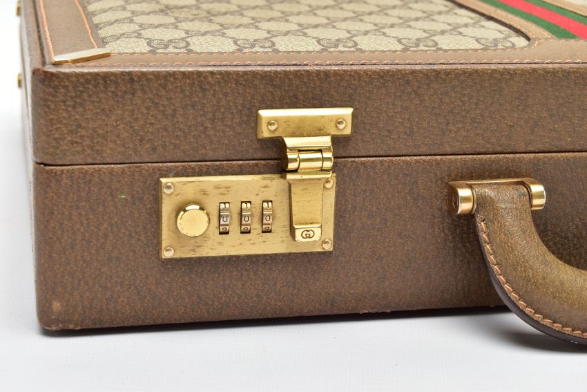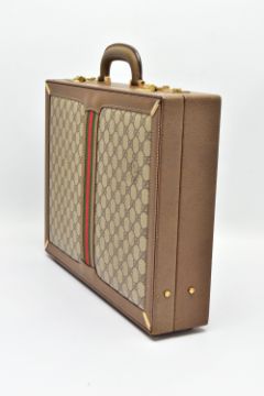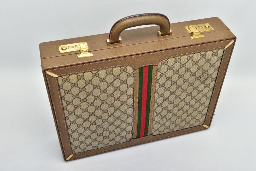 A VINTAGE GUCCI BRIEFCASE WITH GREEN LEATHER TRIM, the front and back vinyl panels with Gucci logos and red and green fabric band to the centre, the natural and green leather interior fitted with fabric lined expanding stationery holder, embossed with gilt serial no. '016-067-1183' and gilt 'Gucci Italy' badge, comes with green leather key cover and luggage label, together with combination lock instructions by OCS, width 42cm x depth 32cm x height 9.3cm (Condition report: there is a stain to the vinyl on the left hand panel of the top and to the right hand vinyl panel on the base, some wear to the corner mounts, the interior has a stain in the back left corner and generally smells fusty, with a few mould spots on the stationery holder that appear to wipe off)