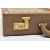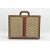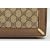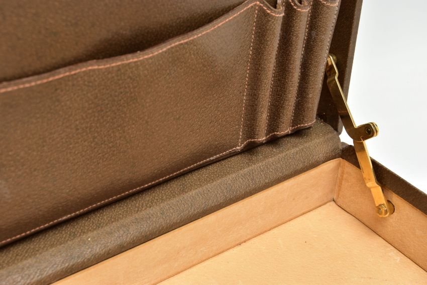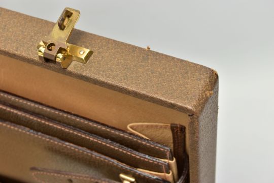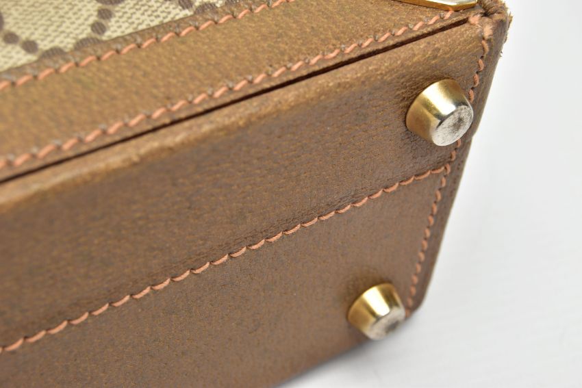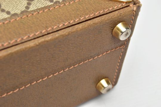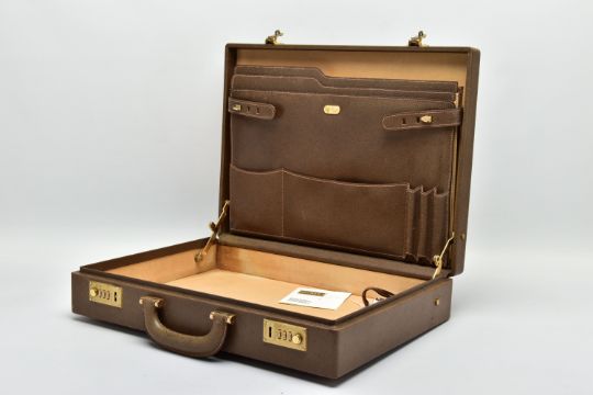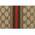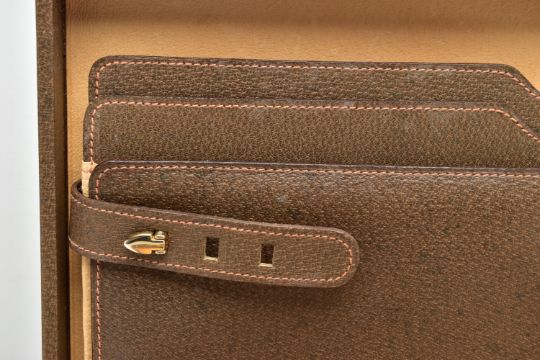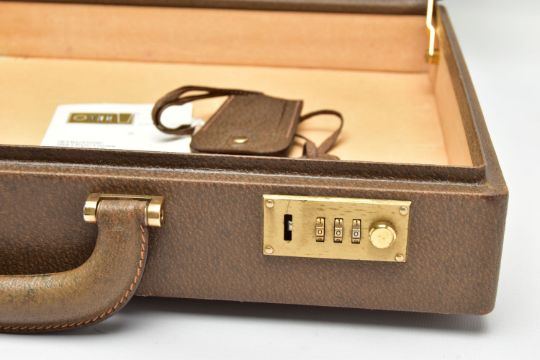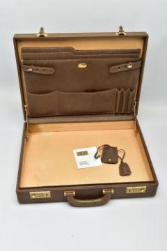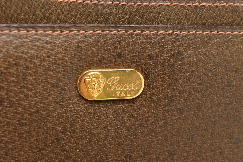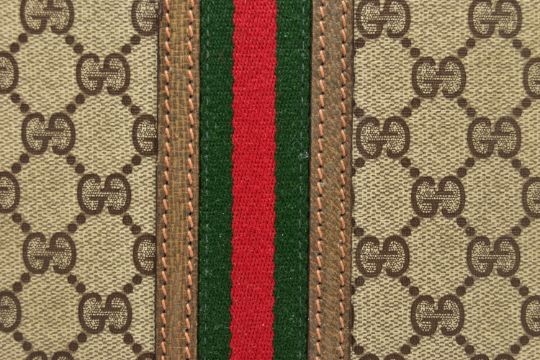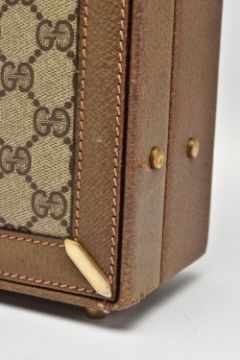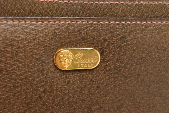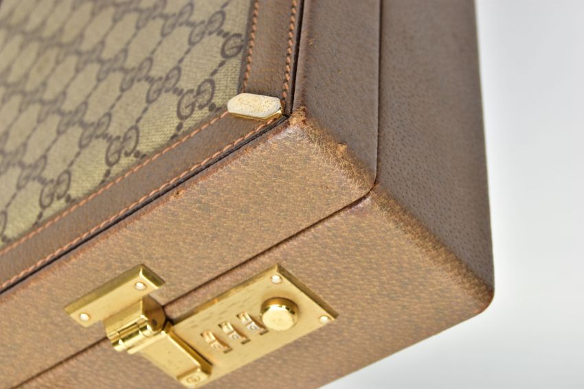 A VINTAGE GUCCI BRIEFCASE WITH GREEN LEATHER TRIM, the front and back vinyl panels with Gucci logos and red and green fabric band to the centre, the natural and green leather interior fitted with fabric lined expanding stationery holder, embossed with gilt serial no. '016-067-1183' and gilt 'Gucci Italy' badge, comes with green leather key cover and luggage label, together with combination lock instructions by OCS, width 42cm x depth 32cm x height 9.3cm (Condition report: there is a stain to the vinyl on the left hand panel of the top and to the right hand vinyl panel on the base, some wear to the corner mounts, the interior has a stain in the back left corner and generally smells fusty, with a few mould spots on the stationery holder that appear to wipe off)