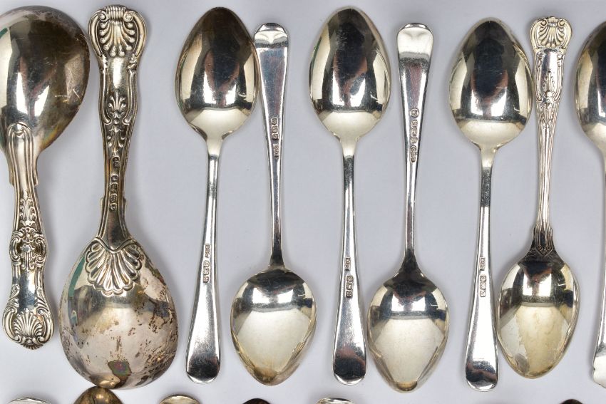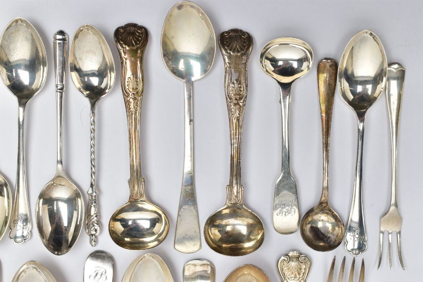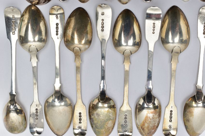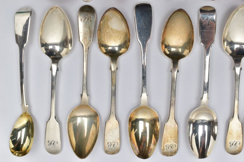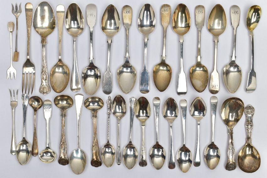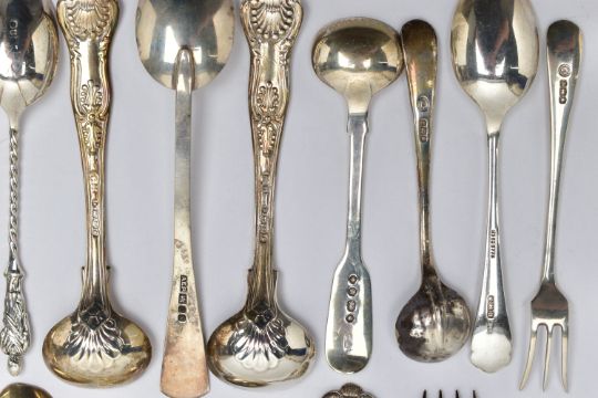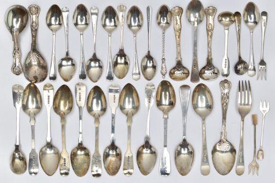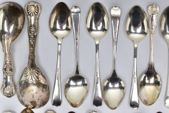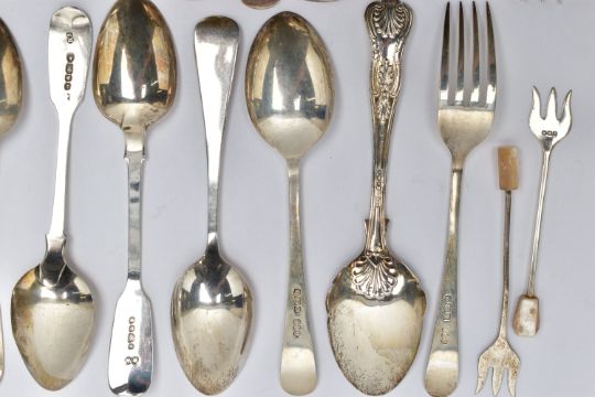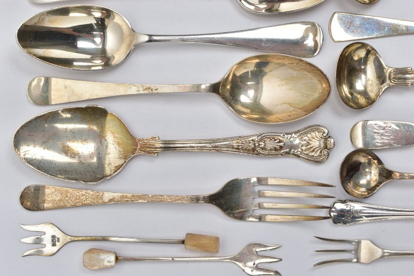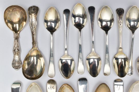 A PARCEL OF ASSORTED 19TH AND 20TH CENTURY FLATWARE IN KINGS PATTERN, FIDDLE PATTERN, OLD ENGLISH PATTERN, ETC, including a Victorian Queen's pattern caddy spoon, maker George Aldwinckle, London 1876, and another similar in Kings pattern, makers Chawner & Co (George William Adams), London 1850, a pair of Victorian Kings pattern condiment spoons, maker Charles Boyton II, London 1860, etc, gross weight of all items 18.33ozt, 570 grams (Parcel) (Condition report: all items are in useable condition, some items have engraved initials, crests or monograms, some marks have rubbing)