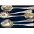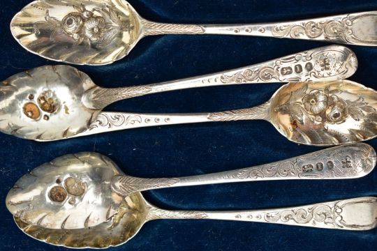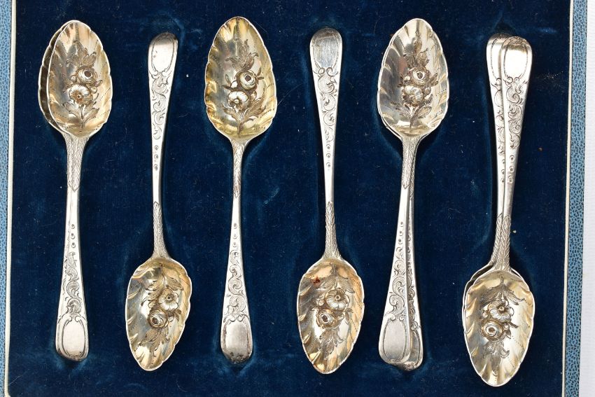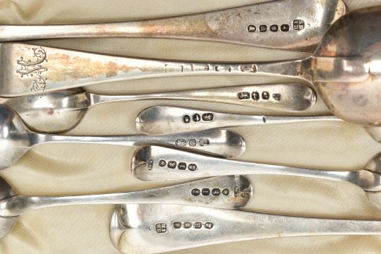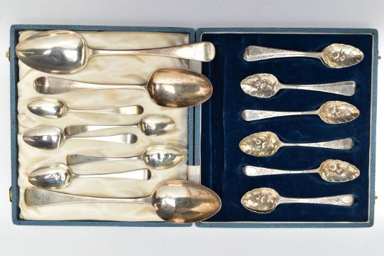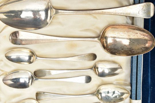 GEORGE III SILVER SPOONS, nine silver old English teaspoons, reworked at a later date (possibly mid Victorian) with floral designs and bright cut patterns, hallmarked 'William Eley & William Fearn' London 1804, two Hanoverian table spoons, engraved with the letter L, hallmarked 'Sarah & John William Blake' London 1816, together with additional silver teaspoons, approximate gross weight 13.15ozt, 409 grams, together with a blue lined cutlery case, not compatible to cutlery detailed (Parcel) (Condition report: general moderate wear, some light scratches and indenting)