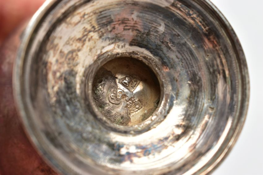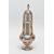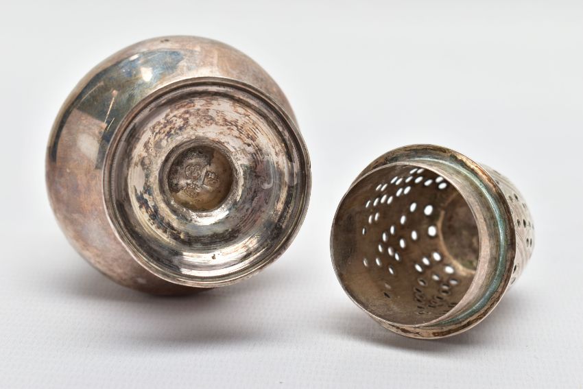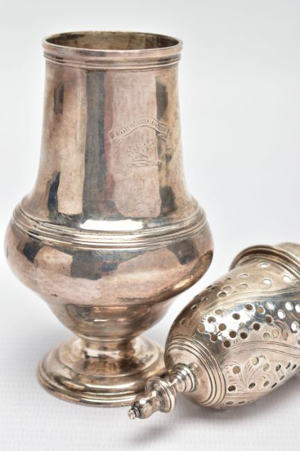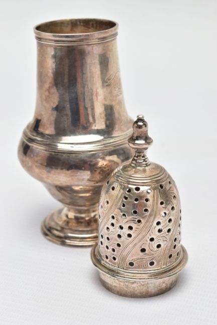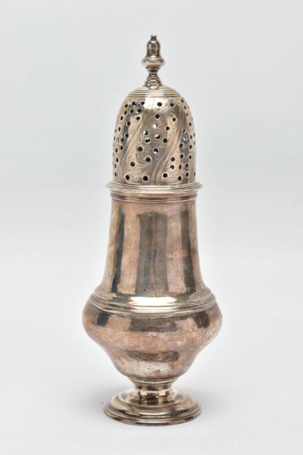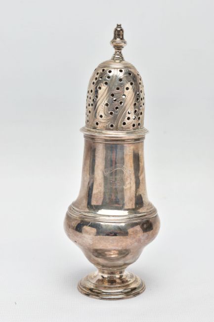 A GEORGE III SCOTTISH SILVER SUGAR CASTER OF BALUSTER FORM, unmarked pull off cover with urn shaped finial and foliate engraved decoration, the plain body engraved with a crest and motto 'Forward Ours', stepped circular foot, no maker's mark, Edinburgh 1766, 5.01ozt, 155.9 grams, height 17cm (Condition report: crest worn, a few minor dints, generally in good useable condition)