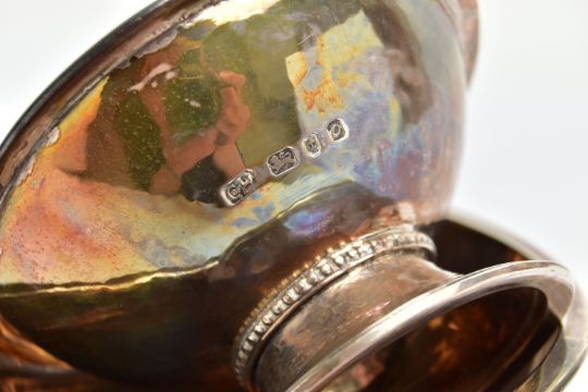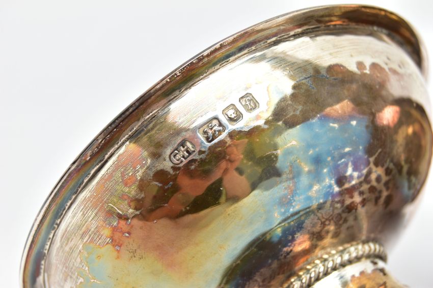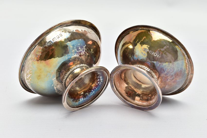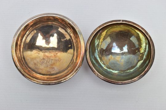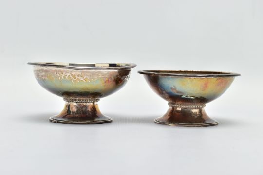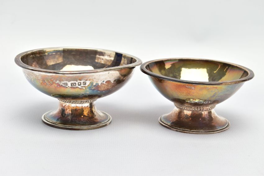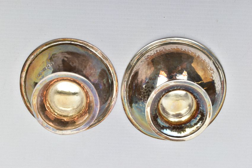 TWO ELIZABETH II GEORGE HENRY HART FOR THE GUILD OF HANDICRAFT SILVER BOWLS, the first a lightly planished bowl set upon a silver stand detail with a rope design, approximate dimensions height 50mm x width 99mm, hallmarked 'Guild of Handicraft' London 1961, the second a slightly smaller bowl similar in design, detailed with beading around the stand, approximate dimensions height 45mm x width 89mm, hallmarked 'Guild of Handicraft' London 1969, approximate gross weight 7.79ozt, 242.4 grams (2) (Condition report: general moderate wear, some light scratches, would benefit from a gentle clean and polish)