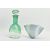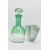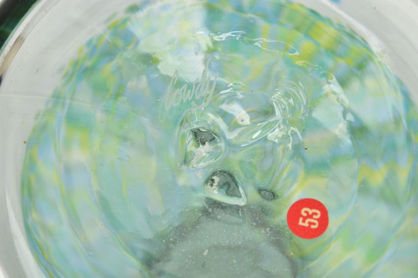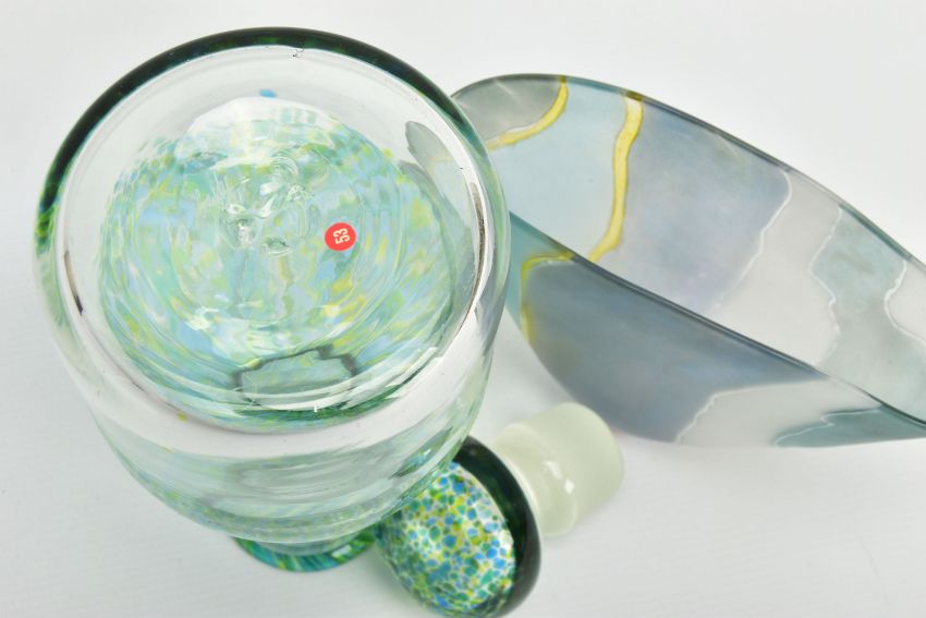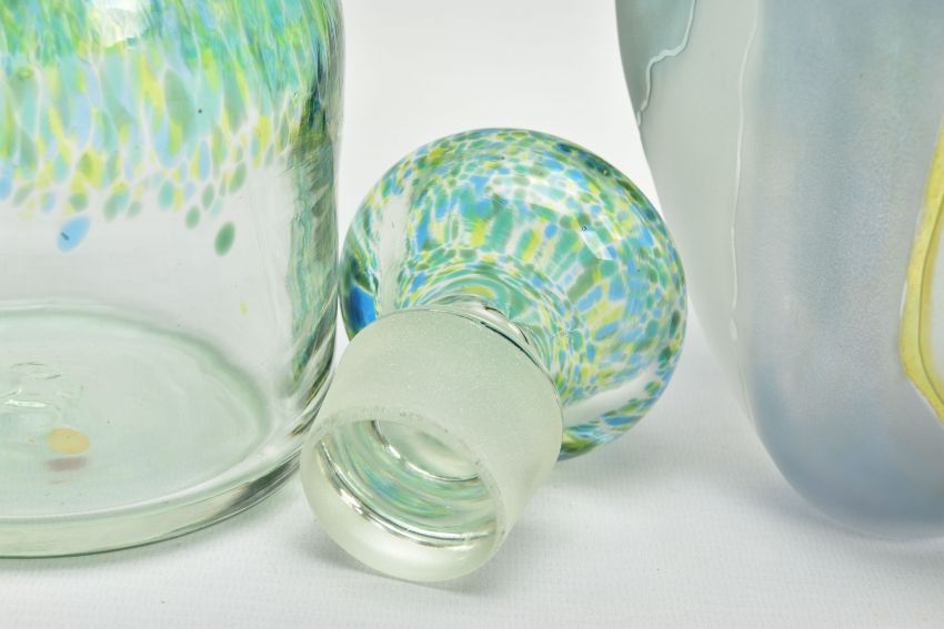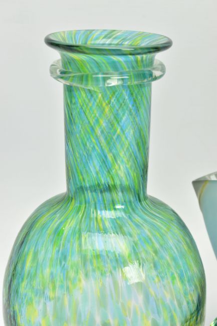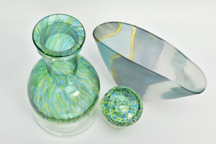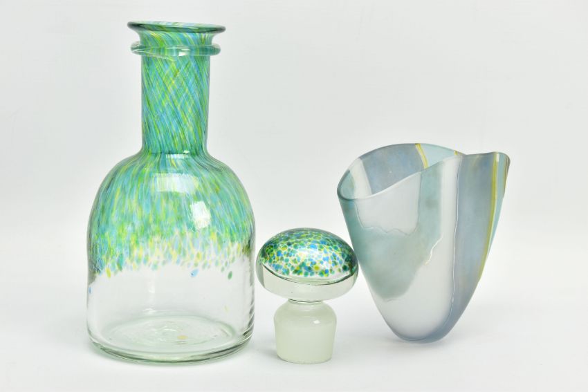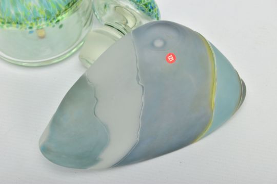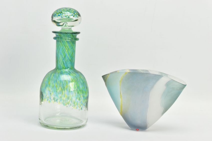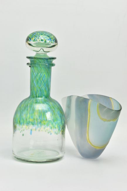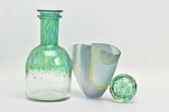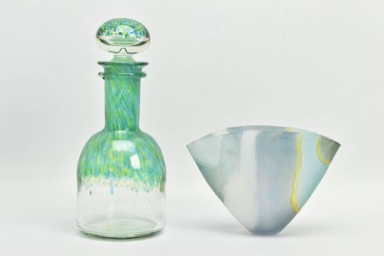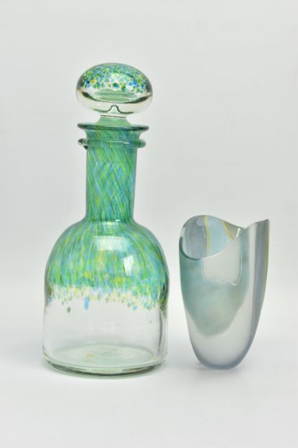 PAULINE SOLVEN (BRITISH 1943) A CONICAL GLASS VASE OF COMPRESSED FORM, the exterior having alternating bands of frosted and clear glass stripes, signed and dated 1988 around the bottom edge, maximum approximate height 15cm, together with a Pauline Solven for Cowdy Glass decanter, mottled green over a clear base, signed Cowdy to the base, approximate height 29cm (2) (Condition report: no obvious damage to either piece)