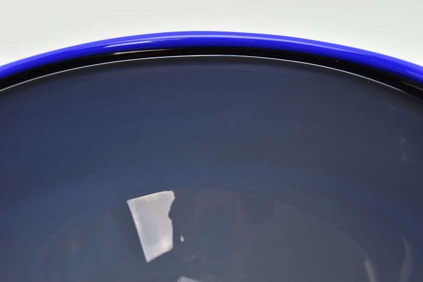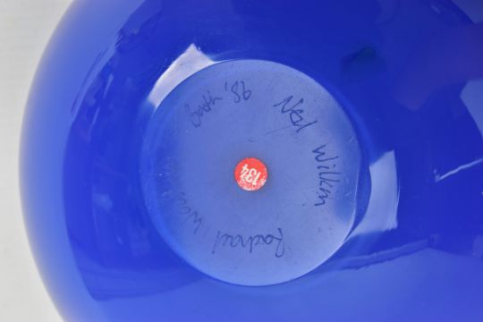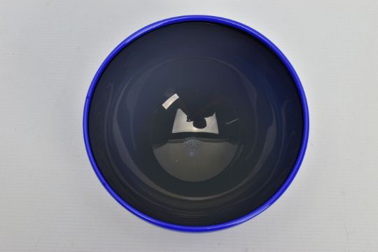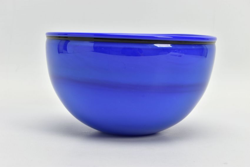 RACHAEL WOODMAN / NEIL WILKIN (BRITISH CONTEMPORARY) A LATE 20TH CENTURY SOMMERSO BOWL, blue over grey with a black band beneath the rim, signed and dated Bath '86 to the base, approximate height 10.5cm (Condition report: no obvious damage but there is a 1cm tool mark near to the bottom edge)