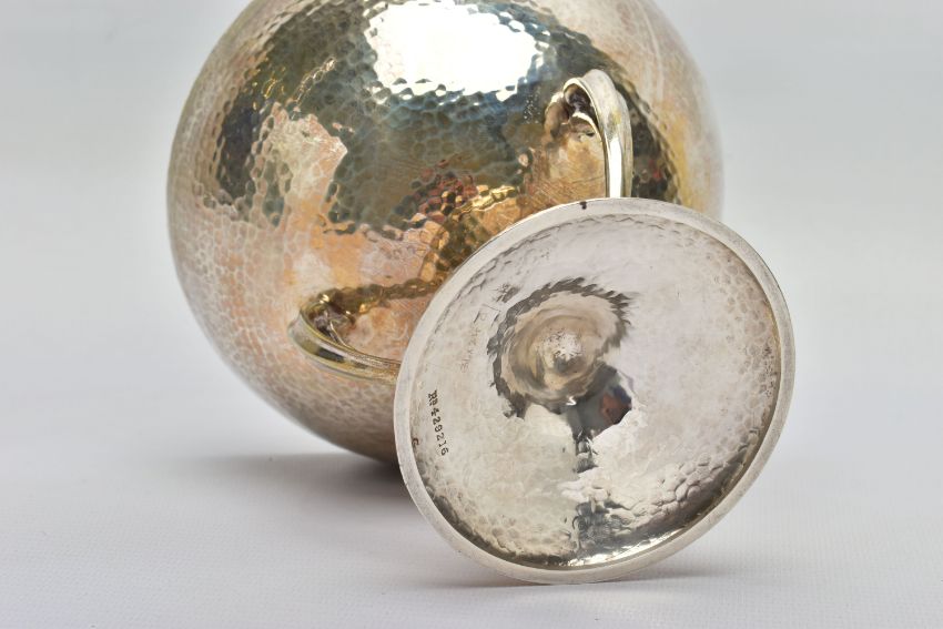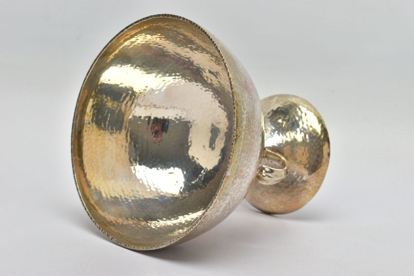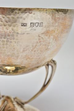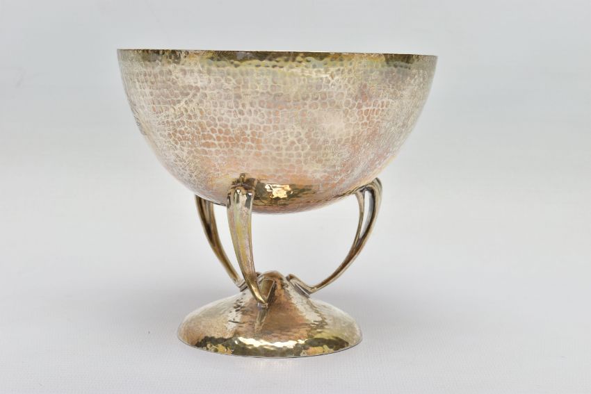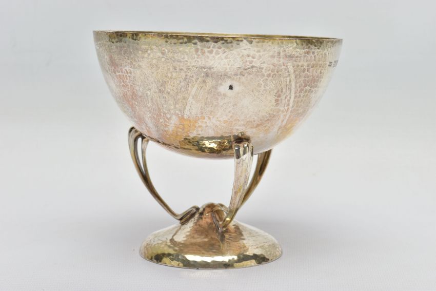 AN ARTS & CRAFTS SILVER PEDESTAL DISH, the circular hand hammered bowl engraved with the crest of Clan Stewart of Galloway, on three sinuous open legs to a domed circular foot, registration no. 429216, makers Mappin & Webb, London 1906, 10.72ozt, 333.5 grams, height 13cm (Condition report: almost sitting level on a flat surface, in generally good condition overall, one spot of black to the bowl)