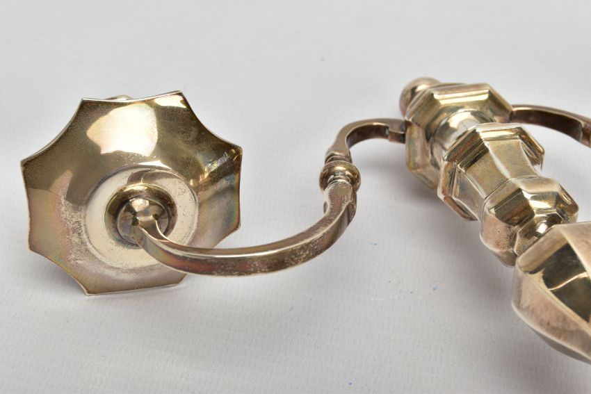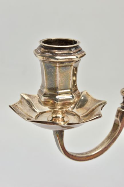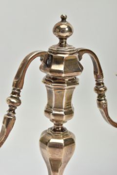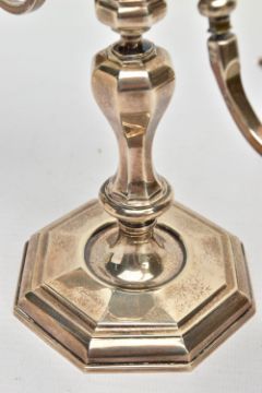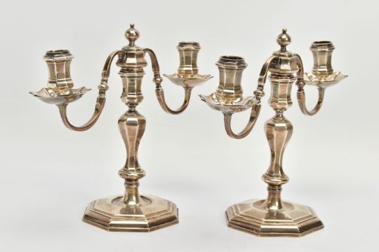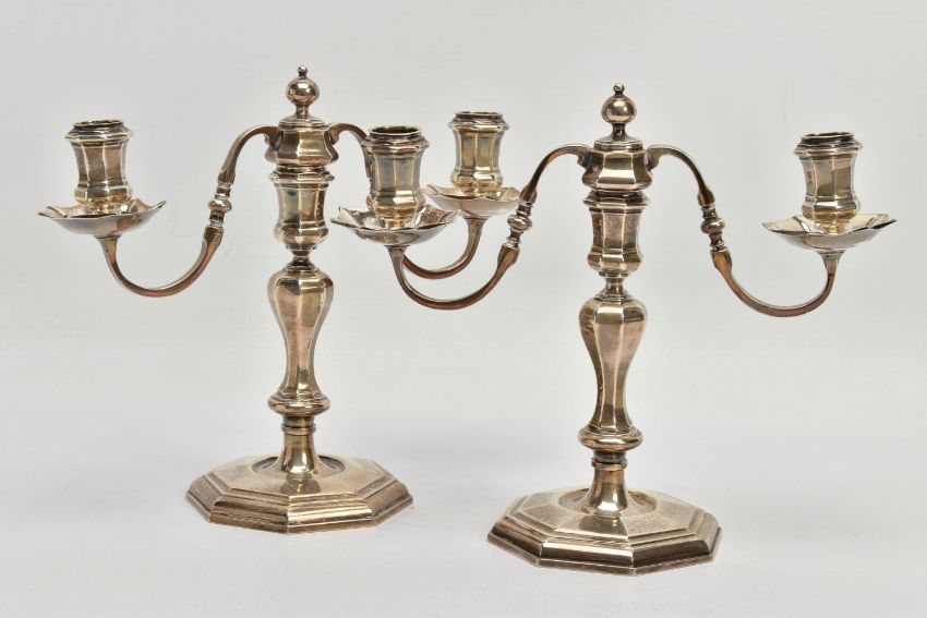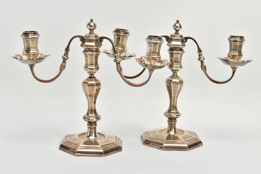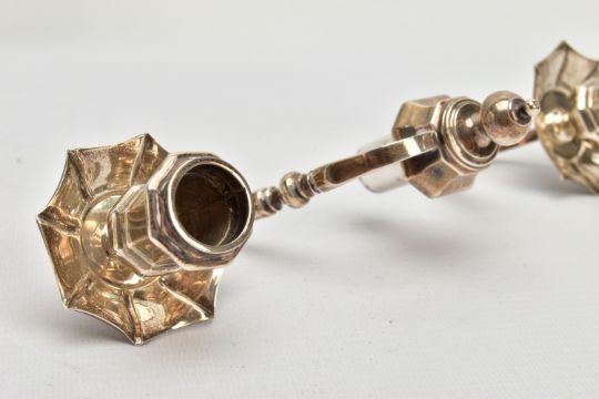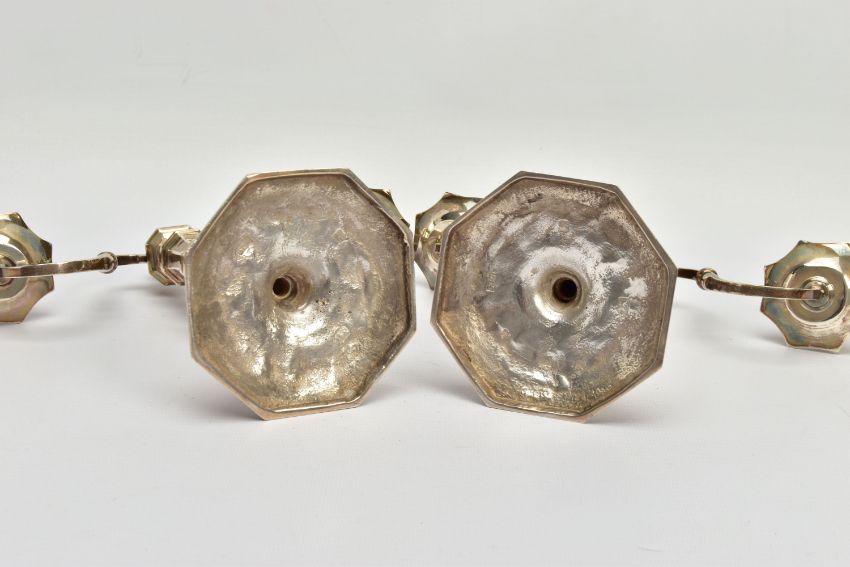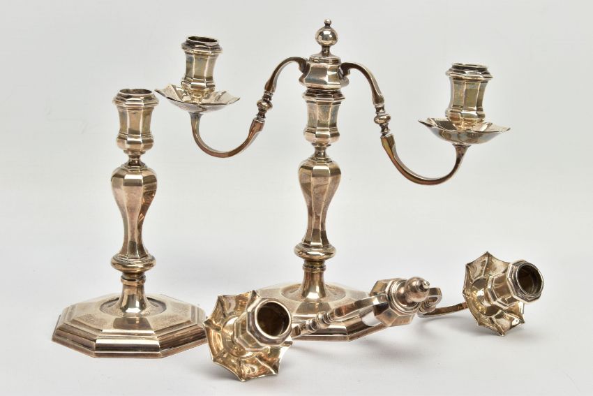A PAIR OF GEORGE I STYLE SILVER CANDLESTICKS OF OCTAGONAL FORM, baluster stems, stepped octagonal bases, maker Stuart Clive Griffiths, Birmingham 1975, height 14.5cm, 26.7ozt, 830.5 grams, together with a pair of unmarked two branch candleholders to fit into the candlesticks, no visible marks (4) (Condition report: candlesticks sit level on a flat surface, the branches are slightly bent)