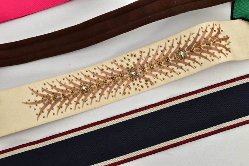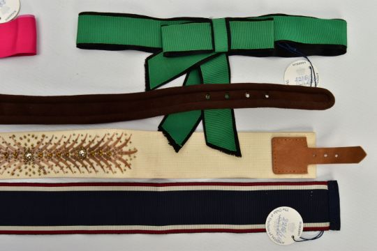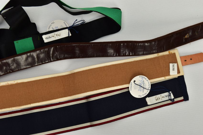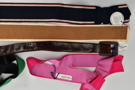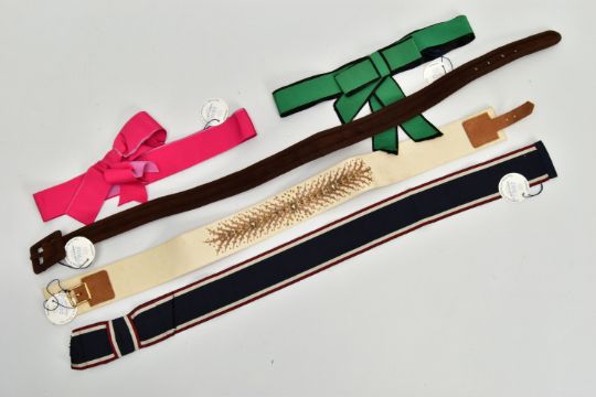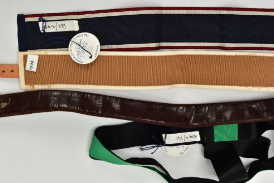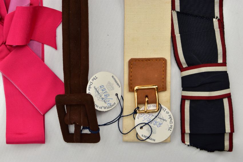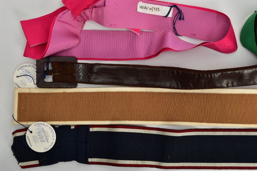 DUKE & DUCHESS OF WINDSOR INTEREST, five fabric and suede belts, in a variety of styles and colours, part of ex lot 2216 Sotheby's The Duke & Duchess of Windsor auction September 11-19, 1997 (5) (Condition report: all five belts retain the Sotheby's lot number tags, the ribbon belts are a bit frayed and appear to be hand crafted)