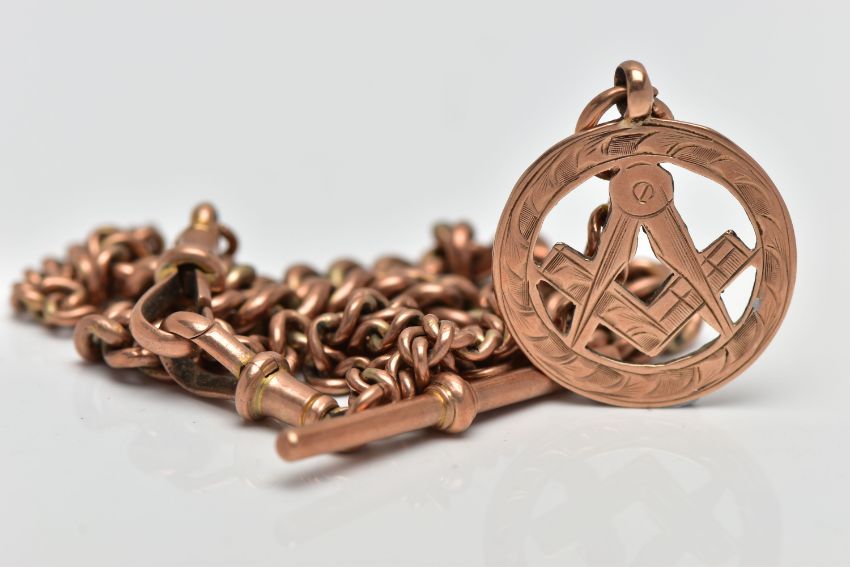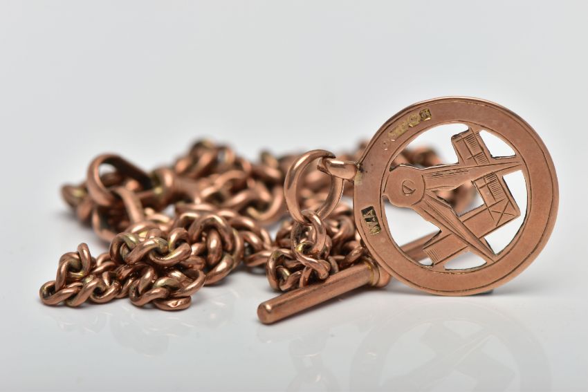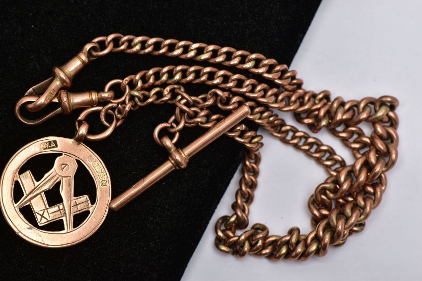A 9CT GOLD MASONIC CHARM AND ROSE METAL ALBERT CHAIN, a graduated curb link chain fitted with two lobster clasps and a T-bar, approximate length 372mm, stamped 9ct on each link and fittings, fitted with a rose gold masonic charm, hallmarked 9ct Birmingham 1918, approximate gross weight 14.2 grams (condition report: general moderate wear, stamps are very worn on chain links, overall condition good)