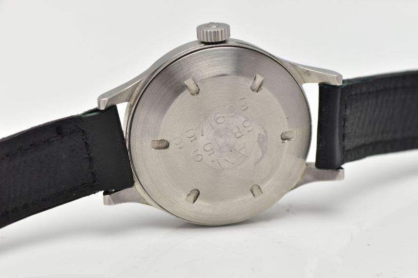 A VINTAGE MID 20TH CENTURY STAINLESS STEEL MANUAL WIND OMEGA WRISTWATCH, the matt black dial, with luminescent Arabic numerals, silver coloured illuminescent hands, approximate case diameter 34mms, enclosing plexi glass, case back engraved AM 6B/159 509/56, inside case back not signed, copper tension ring present inside case, movement numbered 9740826, cal. 30 T2 SC, the watch is on a black leather strap with Omega tang buckle (condition report: overall condition good, watch untested for time keeping)