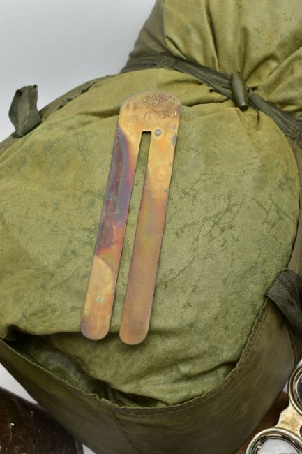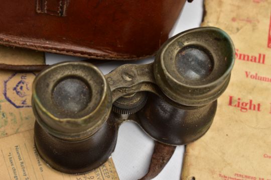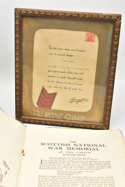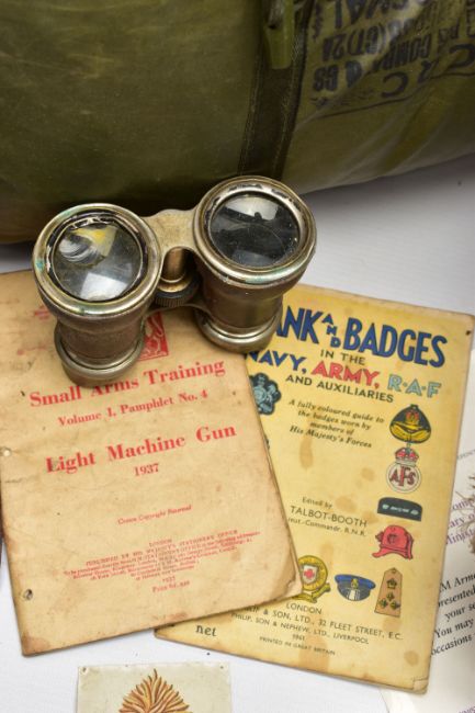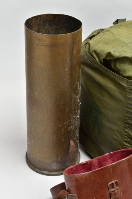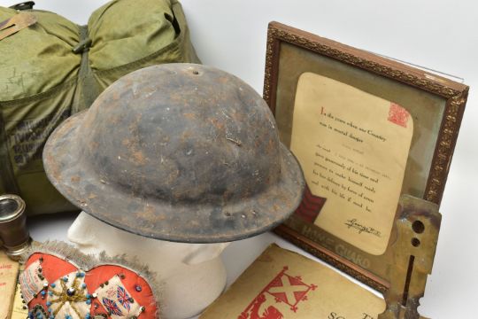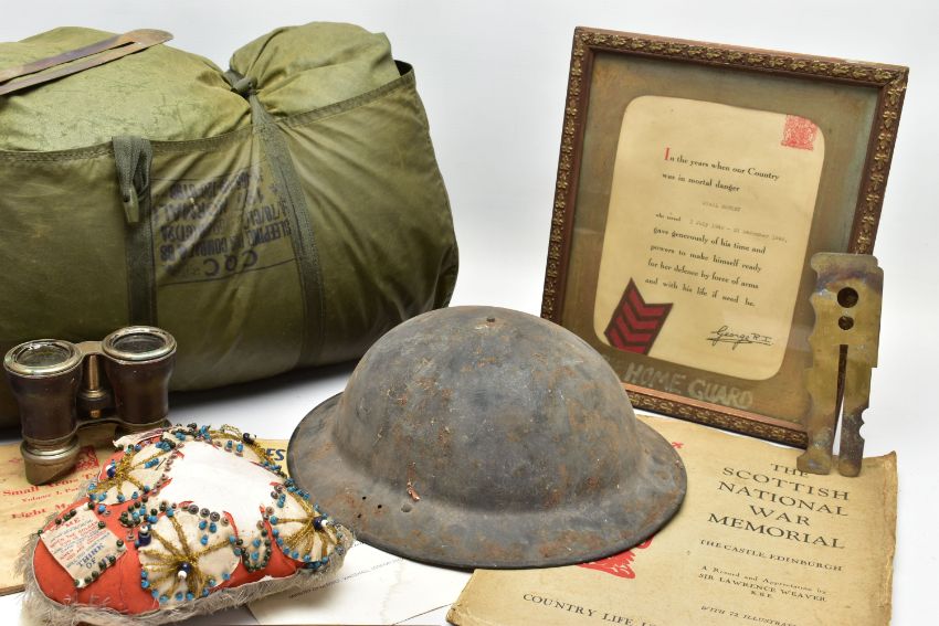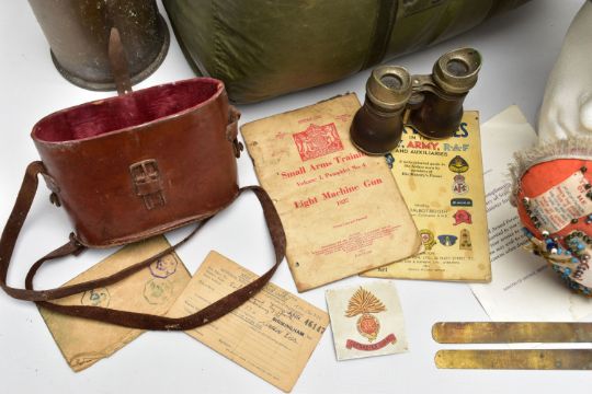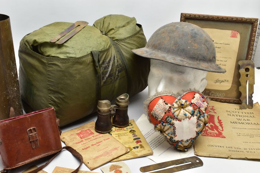 A LARGE BOX OF ASSORTED MILITARIA to include, WW1/2 British Helmet with liner, inert shell case(field Gun) silk cushion in heart shape, framed Home Guard Certificate, misc documents ID Cards etc, binoculars in case, sleeping bag in cover, etc