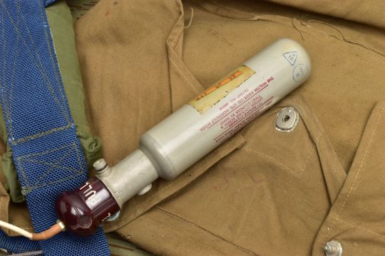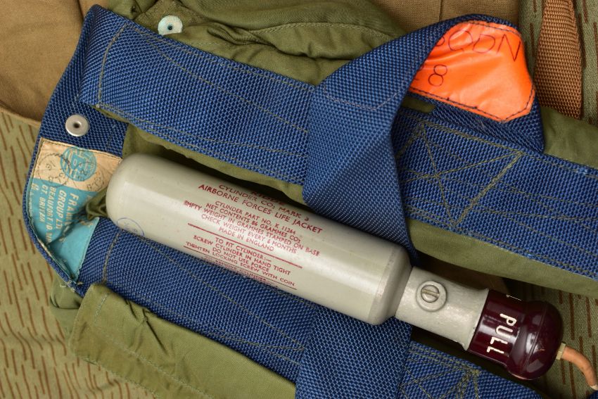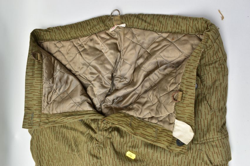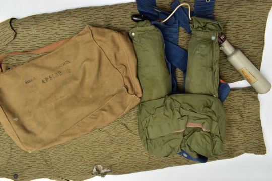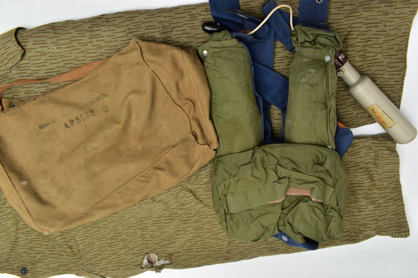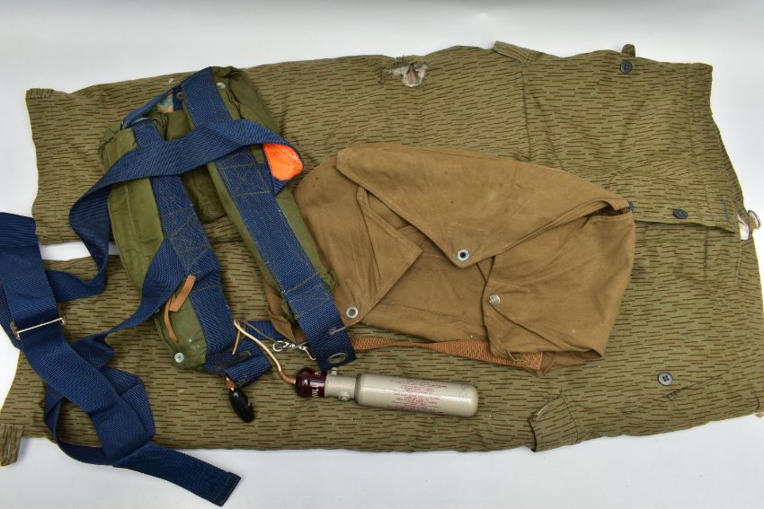BOX CONTAINING A POSTWW2 ERA AIRBORNE FORCES LIFE JACKET, in its issue case and complete with 'KIDDE' CO2 cylinder MKIII, the jacket itself is in good condition and marked with an orange tab 847 Sqdn, No 28, together with a pair of padded Military Camoflouge trousers, similar to the German WW2 pattern rain holes in legs and possibly Warsaw pact post WW2