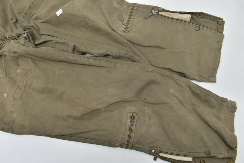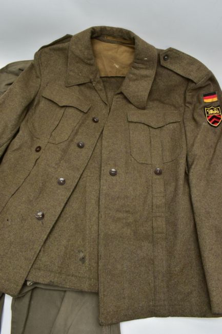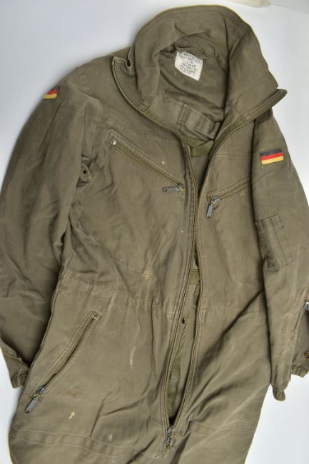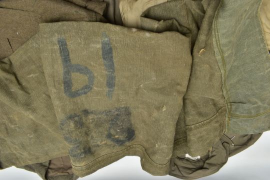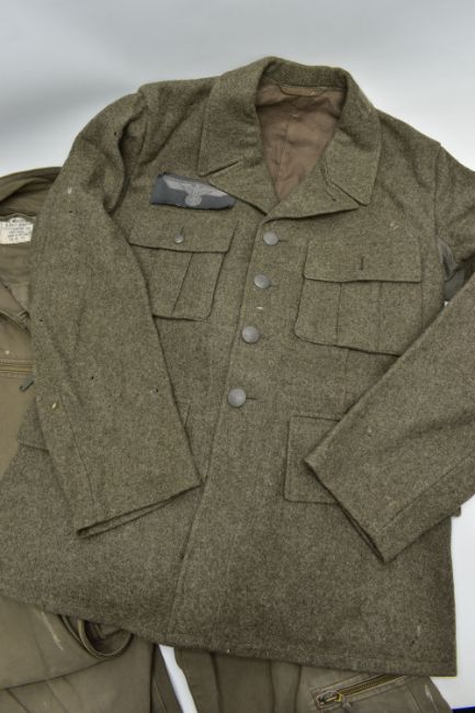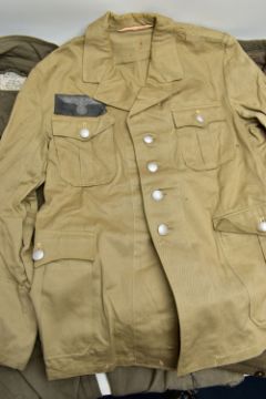 A LARGE BOX CONTAINING A LARGE ARMY KIT BAG WITH MARKINGS, two replica German WW2 Jackets one liteweight, with replica insignia, a post WW2 German Boiler style overall with insignia and post WW2 German Army jacket