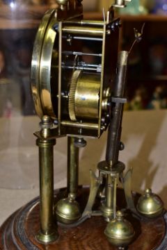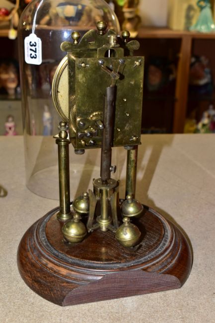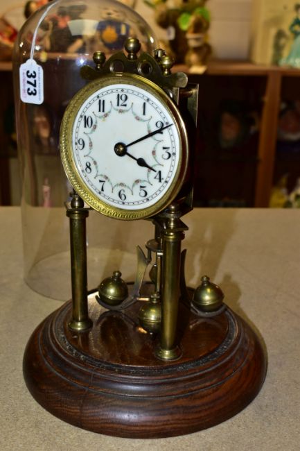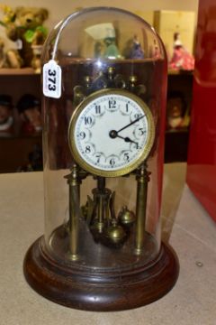 A GLASS DOMED ANNIVERSARY CLOCK, columns, crown and pendulum with brass application , wooden pedestal, pie crust bezel, cream coloured dial with Arabic numerals and a wreath of roses (1) (condition report: does not appear to be working, glass has nibbles around the base)